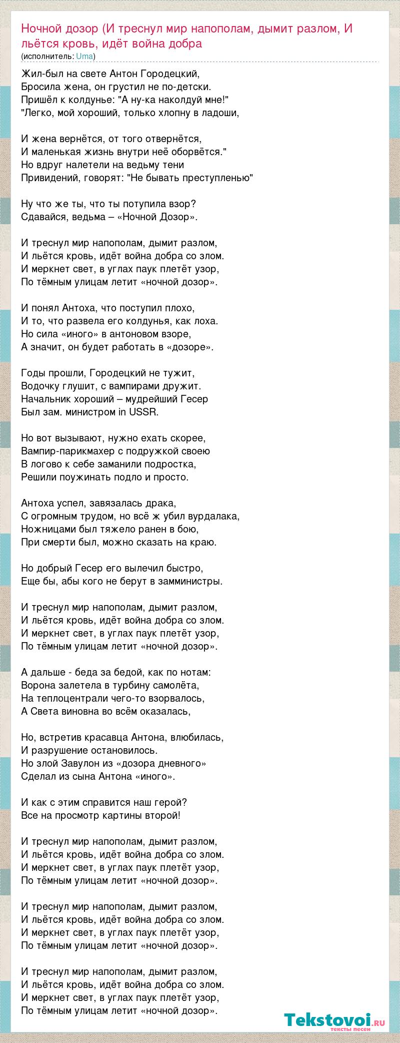 Жил-был на свете Антон Городецкий, Бросила жена, он грустил не по-детски. Пришёл к колдунье: "А ну-ка наколдуй мне!" "Легко, мой хороший, только хлопну в ладоши, И жена вернётся, от того отвернётся, И маленькая жизнь внутри неё оборвётся." Но вдруг налетели на ведьму тени Привидений, говорят: "Не бывать преступленью" Ну что же ты, что ты потупила взор? Сдавайся, ведьма – «Ночной Дозор». И треснул мир напополам, дымит разлом, И льётся кровь, идёт война добра со злом. И меркнет свет, в углах паук плетёт узор, По тёмным улицам летит «ночной дозор». И понял Антоха, что поступил плохо, И то, что развела его колдунья, как лоха. Но сила «иного» в антоновом взоре, А значит, он будет работать в «дозоре». Годы прошли, Городецкий не тужит, Водочку глушит, с вампирами дружит. Начальник хороший – мудрейший Гесер Был зам. министром in USSR. Но вот вызывают, нужно ехать скорее, Вампир-парикмахер с подружкой своею В логово к себе заманили подростка, Решили поужинать подло и просто. Антоха успел, завязалась драка, С огромным трудом, но всё ж убил вурдалака, Ножницами был тяжело ранен в бою, При смерти был, можно сказать на краю. Но добрый Гесер его вылечил быстро, Еще бы, абы кого не берут в замминистры. И треснул мир напополам, дымит разлом, И льётся кровь, идёт война добра со злом. И меркнет свет, в углах паук плетёт узор, По тёмным улицам летит «ночной дозор». А дальше - беда за бедой, как по нотам: Ворона залетела в турбину самолёта, На теплоцентрали чего-то взорвалось, А Света виновна во всём оказалась, Но, встретив красавца Антона, влюбилась, И разрушение остановилось. Но злой Завулон из «дозора дневного» Сделал из сына Антона «иного». И как с этим справится наш герой? Все на просмотр картины второй! И треснул мир напополам, дымит разлом, И льётся кровь, идёт война добра со злом. И меркнет свет, в углах паук плетёт узор, По тёмным улицам летит «ночной дозор». И треснул мир напополам, дымит разлом, И льётся кровь, идёт война добра со злом. И меркнет свет, в углах паук плетёт узор, По тёмным улицам летит «ночной дозор». И треснул мир напополам, дымит разлом, И льётся кровь, идёт война добра со злом. И меркнет свет, в углах паук плетёт узор, По тёмным улицам летит «ночной дозор».