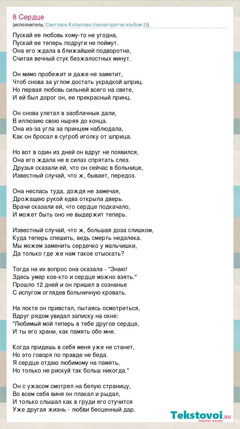 Пускай ее любовь кому-то не угодна, Пускай ее теперь подруги не поймут. Она его ждала в ближайшей подворотне, Считая вечный стук безжалостных минут. Он мимо пробежит и даже не заметит, Чтоб снова за углом достать украдкой шприц. Но первая любовь сильней всего на свете, И ей был дорог он, ее прекрасный принц. Он снова улетал в заоблачные дали, В иллюзию свою ныряя до конца. Она из-за угла за принцем наблюдала, Как он бросал в сугроб иголку от шприца. Но вот в один из дней он вдруг не появился, Она его ждала не в силах спрятать слез. Друзья сказали ей, что он сейчас в больнице, Известный случай, что ж, бывает, передоз. Она неслась туда, дождя не замечая, Дрожащею рукой едва открыла дверь. Врачи сказали ей, что сердце подкачало, И может быть оно не выдержит теперь. Известный случай, что ж, большая доза слишком, Куда теперь спешить, ведь смерть недалека. Мы можем заменить сердечко у мальчишки, Да только где же нам такое отыскать? Тогда на их вопрос она сказала - "Знаю! Здесь умер кое-кто и сердце можно взять." Прошло 12 дней и он пришел в сознанье С испугом оглядев больничную кровать. На локте он привстал, пытаясь осмотреться, Вдруг рядом увидал записку на окне: "Любимый мой теперь в тебе другое сердце, И ты его храни, как память обо мне. Когда придешь в себя меня уже не станет, Но это говоря по правде не беда. Я сердце отдаю любимому на память, Но только не рискуй так больш никогда." Он с ужасом смотрел на белую страницу, Во всем себя виня он плакал и рыдал, И только слышал как в груди его стучится Уже другая жизнь - любви бесценный дар.