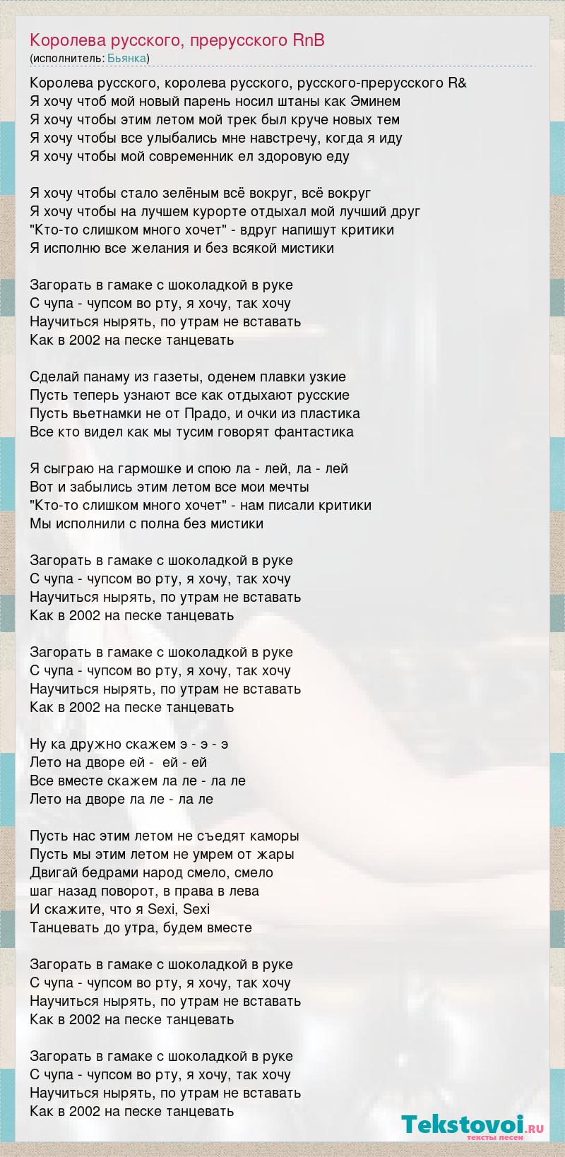 Королева русского, королева русского, русского-прерусского R& Я хочу чтоб мой новый парень носил штаны как Эминем Я хочу чтобы этим летом мой трек был круче новых тем Я хочу чтобы все улыбались мне навстречу, когда я иду Я хочу чтобы мой современник ел здоровую еду Я хочу чтобы стало зелёным всё вокруг, всё вокруг Я хочу чтобы на лучшем курорте отдыхал мой лучший друг "Кто-то слишком много хочет" - вдруг напишут критики Я исполню все желания и без всякой мистики Загорать в гамаке с шоколадкой в руке С чупа - чупсом во рту, я хочу, так хочу Научиться нырять, по утрам не вставать Как в 2002 на песке танцевать Сделай панаму из газеты, оденем плавки узкие Пусть теперь узнают все как отдыхают русские Пусть вьетнамки не от Прадо, и очки из пластика Все кто видел как мы тусим говорят фантастика Я сыграю на гармошке и спою ла - лей, ла - лей Вот и забылись этим летом все мои мечты "Кто-то слишком много хочет" - нам писали критики Мы исполнили с полна без мистики Загорать в гамаке с шоколадкой в руке С чупа - чупсом во рту, я хочу, так хочу Научиться нырять, по утрам не вставать Как в 2002 на песке танцевать Загорать в гамаке с шоколадкой в руке С чупа - чупсом во рту, я хочу, так хочу Научиться нырять, по утрам не вставать Как в 2002 на песке танцевать Ну ка дружно скажем э - э - э Лето на дворе ей - ей - ей Все вместе скажем ла ле - ла ле Лето на дворе ла ле - ла ле Пусть нас этим летом не съедят каморы Пусть мы этим летом не умрем от жары Двигай бедрами народ смело, смело шаг назад поворот, в права в лева И скажите, что я Sexi, Sexi Танцевать до утра, будем вместе Загорать в гамаке с шоколадкой в руке С чупа - чупсом во рту, я хочу, так хочу Научиться нырять, по утрам не вставать Как в 2002 на песке танцевать Загорать в гамаке с шоколадкой в руке С чупа - чупсом во рту, я хочу, так хочу Научиться нырять, по утрам не вставать Как в 2002 на песке танцевать