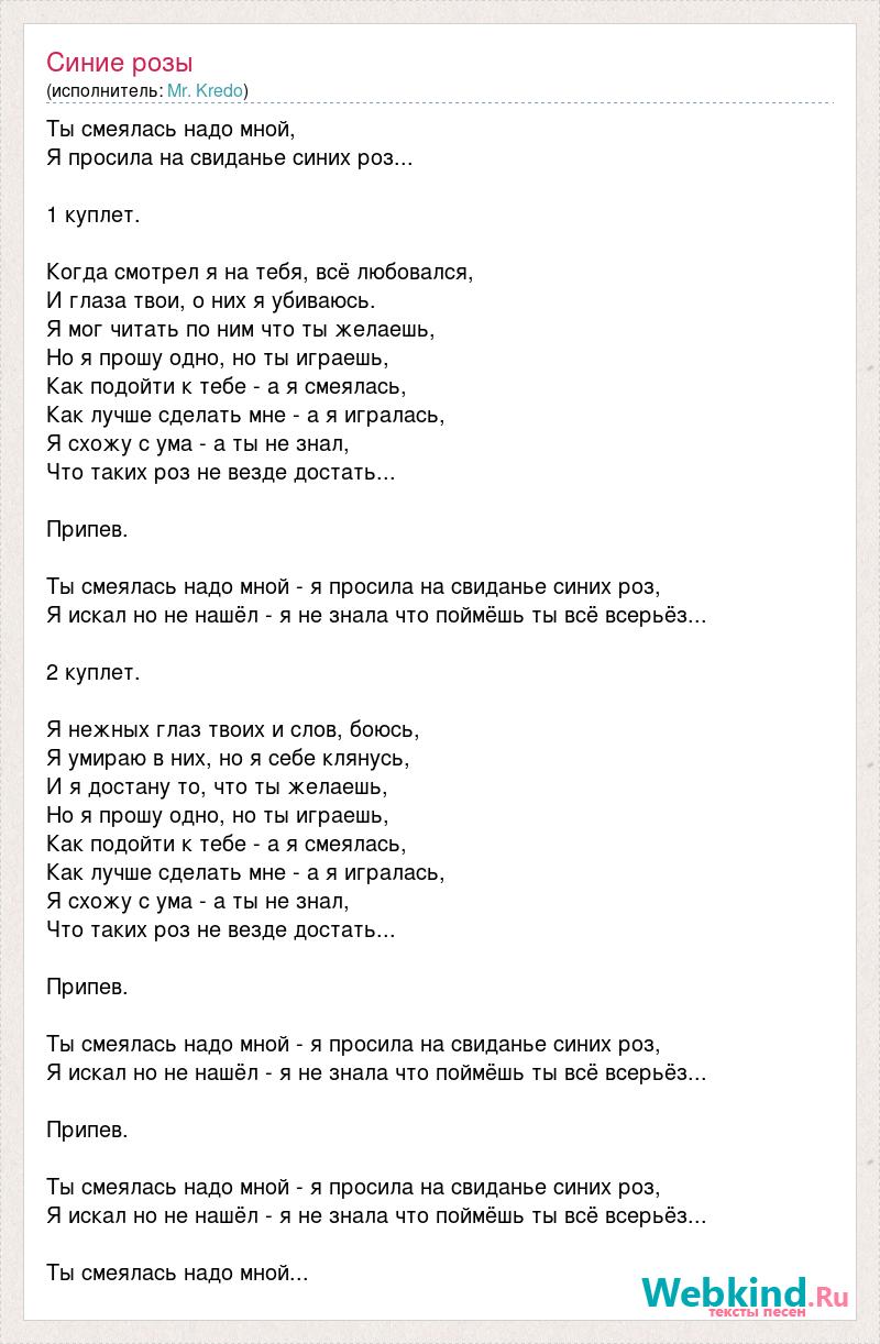 Ты смеялась надо мной, Я просила на свиданье синих роз... 1 куплет. Когда смотрел я на тебя, всё любовался, И глаза твои, о них я убиваюсь. Я мог читать по ним что ты желаешь, Но я прошу одно, но ты играешь, Как подойти к тебе - а я смеялась, Как лучше сделать мне - а я игралась, Я схожу с ума - а ты не знал, Что таких роз не везде достать... Припев. Ты смеялась надо мной - я просила на свиданье синих роз, Я искал но не нашёл - я не знала что поймёшь ты всё всерьёз... 2 куплет. Я нежных глаз твоих и слов, боюсь, Я умираю в них, но я себе клянусь, И я достану то, что ты желаешь, Но я прошу одно, но ты играешь, Как подойти к тебе - а я смеялась, Как лучше сделать мне - а я игралась, Я схожу с ума - а ты не знал, Что таких роз не везде достать... Припев. Ты смеялась надо мной - я просила на свиданье синих роз, Я искал но не нашёл - я не знала что поймёшь ты всё всерьёз... Припев. Ты смеялась надо мной - я просила на свиданье синих роз, Я искал но не нашёл - я не знала что поймёшь ты всё всерьёз... Ты смеялась надо мной...