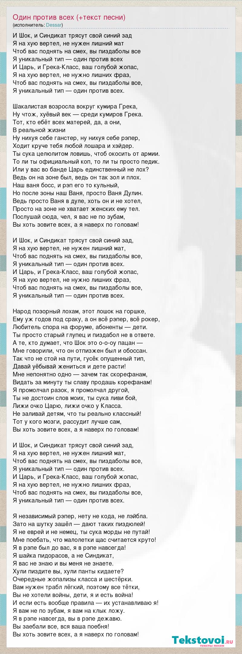 И Шок, и Синдикат трясут свой синий зад Я на хую вертел, не нужен лишний мат Чтоб вас поднять на смех, вы пиздаболы все Я уникальный тип — один против всех И Царь, и Грека-Класс, ваш голубой жопас, Я на хую вертел, не нужно лишних фраз, Чтоб вас поднять на смех, вы пиздаболы все, Я уникальный тип — один против всех. Шакалистая возросла вокруг кумира Грека, Ну чтож, хуёвый век — среди кумиров Грека. Тот, кто ебёт всех матерей, да, а они, В реальной жизни Ну нихуя себе ганстер, ну нихуя себе рэпер, Ходит круче тебя любой лошара и хэйдер. Ты сука целюлитом ловишь, чтоб окосить от армии. То ли ты официальный коп, то ли ты просто педик. Или у вас во банде Царь единственный не лох? Ведь он на зоне был, ведь он так зол и плох. Наш ваня босс, и рэп его то кульный, Но после зоны наш Ваня, просто Ваня Дулин. Ведь просто Ваня в дуле, хоть он и не хотел, Просто на зоне не хватает женских ему тел. Послушай сюда, чел, я вас не по зубам, Вы хоть зовите всех, а я наверх по головам! И Шок, и Синдикат трясут свой синий зад, Я на хую вертел, не нужен лишний мат, Чтоб вас поднять на смех, вы пиздаболы все, Я уникальный тип — один против всех. И Царь, и Грека-Класс, ваш голубой жопас, Я на хую вертел, не нужно лишних фраз, Чтоб вас поднять на смех, вы пиздаболы все, Я уникальный тип — один против всех. Народ позорный лохам, этот лошок на горшке, Ему уж годов под сраку, а он всё рэпер, всё рокер, Любитель спора на форуме, абоненты — дети. Ты просто старый глупец и пиздабол не в ответе. А те, кто думает, что Шок это о-о-оу пацан — Мне говорили, что он отпизжен был и обоссан. Так что не стой на пути, гусёк опущенный тип, Давай уёбывай жениться и дете расти! Мне непонятно одно — зачем так скорефанам, Видать за минуту ты славу продашь корефанам! Я промолчал разок, я промолчал другой, Ты не достоин слов моих, ты сука ливи бой, Лижи очко Царю, лижи очко у Класса. Не заливай детям, что ты реально классный! Тот у кого мозги, рассудит лучше сам, Вы хоть зовите всех, а я наверх по головам! И Шок, и Синдикат трясут свой синий зад, Я на хую вертел, не нужен лишний мат, Чтоб вас поднять на смех, вы пиздаболы все, Я уникальный тип — один против всех. И Царь, и Грека-Класс, ваш голубой жопас, Я на хую вертел, не нужно лишних фраз, Чтоб вас поднять на смех, вы пиздаболы все, Я уникальный тип — один против всех. Я независимый рэпер, нету не кода, не лэйбла. Зато на шутку зашёл — дают таких пиздюлей! Я не еврей и не немец, ты сука морды не путай! Мне поебать, что малолетки щас считается круто! Я в рэпе был до вас, я в рэпе навсегда! Я шайка пидорасов, а не Синдикат, Я вас не знаю и вы меня не знаете. Хули пиздите вы, хули панты кидаете? Очередные жопализы класса и шестёрки. Вам нужен трабл лёгкий, поэтому все тётки, Вы не хотели войны, дети, я и есть война! И если есть вообще правила — их устанавливаю я! Я вам не по зубам, я вам на клык ложу. Я в рэпе навсегда, вы в рэпе дежавю. Вы заебали все, вся ваша поебня! Вы хоть зовите всех, а я наверх по головам!