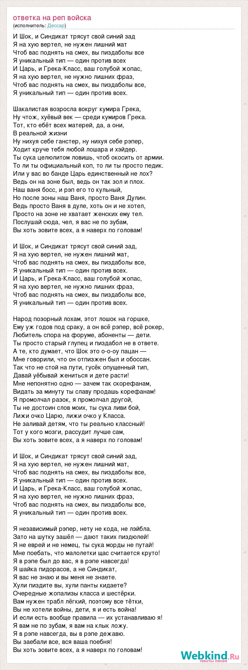 И Шок, и Синдикат трясут свой синий зад Я на хую вертел, не нужен лишний мат Чтоб вас поднять на смех, вы пиздаболы все Я уникальный тип — один против всех И Царь, и Грека-Класс, ваш голубой жопас, Я на хую вертел, не нужно лишних фраз, Чтоб вас поднять на смех, вы пиздаболы все, Я уникальный тип — один против всех. Шакалистая возросла вокруг кумира Грека, Ну чтож, хуёвый век — среди кумиров Грека. Тот, кто ебёт всех матерей, да, а они, В реальной жизни Ну нихуя себе ганстер, ну нихуя себе рэпер, Ходит круче тебя любой лошара и хэйдер. Ты сука целюлитом ловишь, чтоб окосить от армии. То ли ты официальный коп, то ли ты просто педик. Или у вас во банде Царь единственный не лох? Ведь он на зоне был, ведь он так зол и плох. Наш ваня босс, и рэп его то кульный, Но после зоны наш Ваня, просто Ваня Дулин. Ведь просто Ваня в дуле, хоть он и не хотел, Просто на зоне не хватает женских ему тел. Послушай сюда, чел, я вас не по зубам, Вы хоть зовите всех, а я наверх по головам! И Шок, и Синдикат трясут свой синий зад, Я на хую вертел, не нужен лишний мат, Чтоб вас поднять на смех, вы пиздаболы все, Я уникальный тип — один против всех. И Царь, и Грека-Класс, ваш голубой жопас, Я на хую вертел, не нужно лишних фраз, Чтоб вас поднять на смех, вы пиздаболы все, Я уникальный тип — один против всех. Народ позорный лохам, этот лошок на горшке, Ему уж годов под сраку, а он всё рэпер, всё рокер, Любитель спора на форуме, абоненты — дети. Ты просто старый глупец и пиздабол не в ответе. А те, кто думает, что Шок это о-о-оу пацан — Мне говорили, что он отпизжен был и обоссан. Так что не стой на пути, гусёк опущенный тип, Давай уёбывай жениться и дете расти! Мне непонятно одно — зачем так скорефанам, Видать за минуту ты славу продашь корефанам! Я промолчал разок, я промолчал другой, Ты не достоин слов моих, ты сука ливи бой, Лижи очко Царю, лижи очко у Класса. Не заливай детям, что ты реально классный! Тот у кого мозги, рассудит лучше сам, Вы хоть зовите всех, а я наверх по головам! И Шок, и Синдикат трясут свой синий зад, Я на хую вертел, не нужен лишний мат, Чтоб вас поднять на смех, вы пиздаболы все, Я уникальный тип — один против всех. И Царь, и Грека-Класс, ваш голубой жопас, Я на хую вертел, не нужно лишних фраз, Чтоб вас поднять на смех, вы пиздаболы все, Я уникальный тип — один против всех. Я независимый рэпер, нету не кода, не лэйбла. Зато на шутку зашёл — дают таких пиздюлей! Я не еврей и не немец, ты сука морды не путай! Мне поебать, что малолетки щас считается круто! Я в рэпе был до вас, я в рэпе навсегда! Я шайка пидорасов, а не Синдикат, Я вас не знаю и вы меня не знаете. Хули пиздите вы, хули панты кидаете? Очередные жопализы класса и шестёрки. Вам нужен трабл лёгкий, поэтому все тётки, Вы не хотели войны, дети, я и есть война! И если есть вообще правила — их устанавливаю я! Я вам не по зубам, я вам на клык ложу. Я в рэпе навсегда, вы в рэпе дежавю. Вы заебали все, вся ваша поебня! Вы хоть зовите всех, а я наверх по головам!