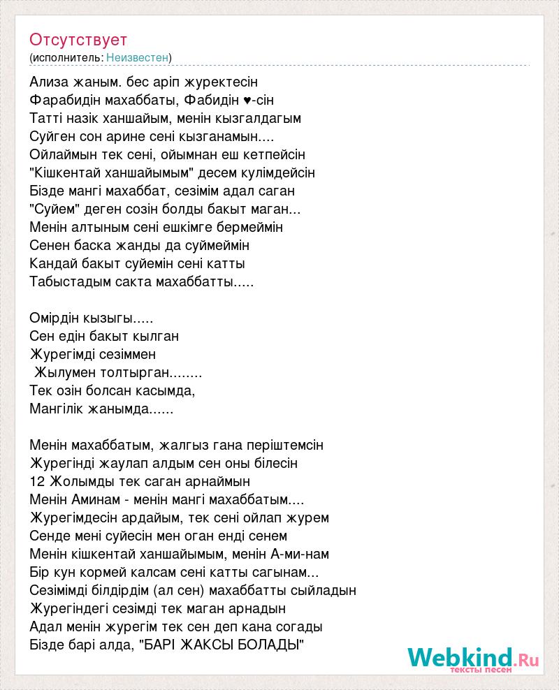 Ализа жаным. бес аріп журектесін Фарабидін махаббаты, Фабидін ♥-cін Татті назік ханшайым, менін кызгалдагым Суйген сон арине сені кызганамын.... Ойлаймын тек сені, ойымнан еш кетпейсін "Кішкентай ханшайымым" десем кулімдейсін Бізде мангі махаббат, сезімім адал саган "Суйем" деген созін болды бакыт маган... Менін алтыным сені ешкімге бермеймін Сенен баска жанды да суймеймін Кандай бакыт суйемін сені катты Табыстадым сакта махаббатты..... Омірдін кызыгы..... Сен едін бакыт кылган Журегімді сезіммен Жылумен толтырган........ Тек озін болсан касымда, Мангілік жанымда...... Менін махаббатым, жалгыз гана періштемсін Журегінді жаулап алдым сен оны білесін 12 Жолымды тек саган арнаймын Менін Аминам - менін мангі махаббатым.... Журегімдесін ардайым, тек сені ойлап журем Сенде мені суйесін мен оган енді сенем Менін кішкентай ханшайымым, менін А-ми-нам Бір кун кормей калсам сені катты сагынам... Сезімімді білдірдім (ал сен) махаббатты сыйладын Журегіндегі сезімді тек маган арнадын Адал менін журегім тек сен деп кана согады Бізде барі алда, "БАРІ ЖАКСЫ БОЛАДЫ"