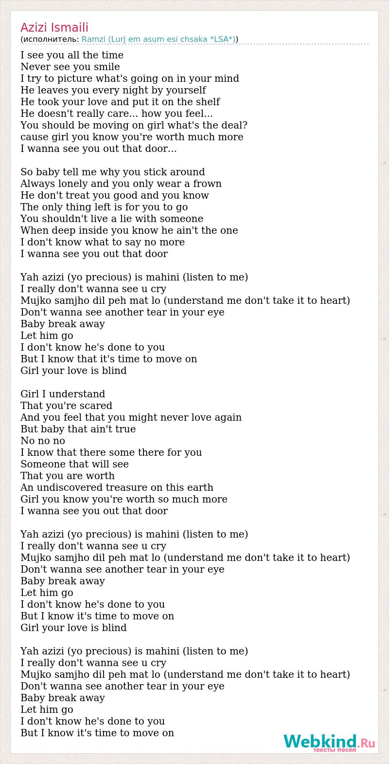 I see you all the time Never see you smile I try to picture what's going on in your mind He leaves you every night by yourself He took your love and put it on the shelf He doesn't really care... how you feel... You should be moving on girl what's the deal? cause girl you know you're worth much more I wanna see you out that door... So baby tell me why you stick around Always lonely and you only wear a frown He don't treat you good and you know The only thing left is for you to go You shouldn't live a lie with someone When deep inside you know he ain't the one I don't know what to say no more I wanna see you out that door Yah azizi (yo precious) is mahini (listen to me) I really don't wanna see u cry Mujko samjho dil peh mat lo (understand me don't take it to heart) Don't wanna see another tear in your eye Baby break away Let him go I don't know he's done to you But I know that it's time to move on Girl your love is blind Girl I understand That you're scared And you feel that you might never love again But baby that ain't true No no no I know that there some there for you Someone that will see That you are worth An undiscovered treasure on this earth Girl you know you're worth so much more I wanna see you out that door Yah azizi (yo precious) is mahini (listen to me) I really don't wanna see u cry Mujko samjho dil peh mat lo (understand me don't take it to heart) Don't wanna see another tear in your eye Baby break away Let him go I don't know he's done to you But I know it's time to move on Girl your love is blind Yah azizi (yo precious) is mahini (listen to me) I really don't wanna see u cry Mujko samjho dil peh mat lo (understand me don't take it to heart) Don't wanna see another tear in your eye Baby break away Let him go I don't know he's done to you But I know it's time to move on