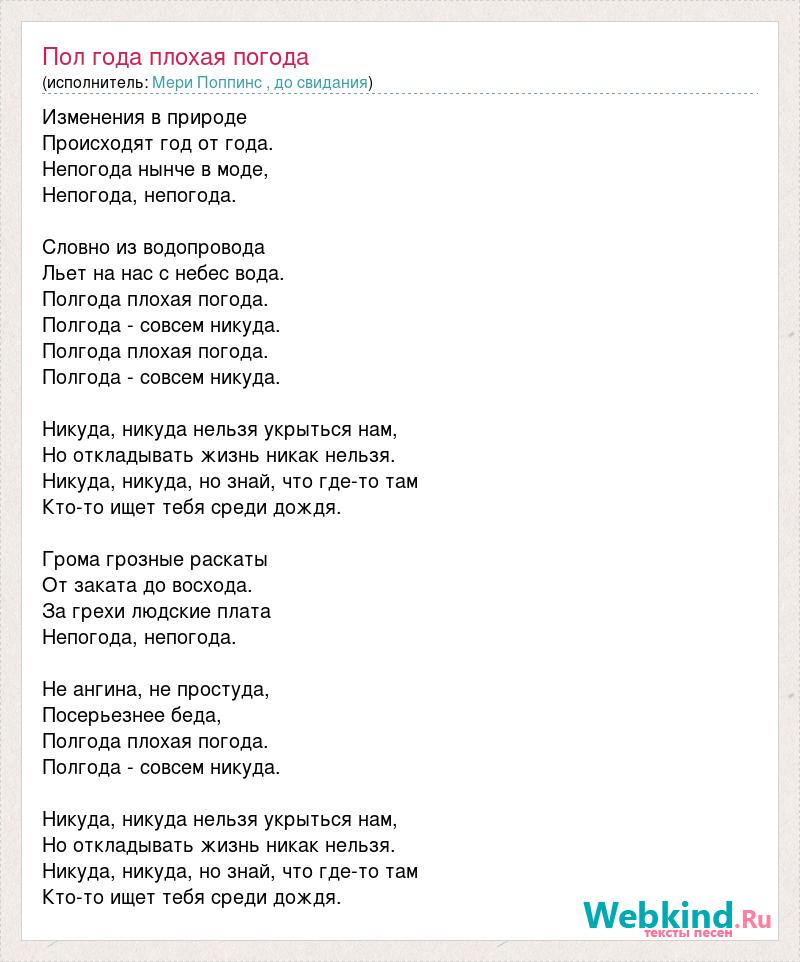 Изменения в природе Происходят год от года. Непогода нынче в моде, Непогода, непогода. Словно из водопровода Льет на нас с небес вода. Полгода плохая погода. Полгода - совсем никуда. Полгода плохая погода. Полгода - совсем никуда. Никуда, никуда нельзя укрыться нам, Но откладывать жизнь никак нельзя. Никуда, никуда, но знай, что где-то там Кто-то ищет тебя среди дождя. Грома грозные раскаты От заката до восхода. За грехи людские плата Непогода, непогода. Не ангина, не простуда, Посерьезнее беда, Полгода плохая погода. Полгода - совсем никуда. Никуда, никуда нельзя укрыться нам, Но откладывать жизнь никак нельзя. Никуда, никуда, но знай, что где-то там Кто-то ищет тебя среди дождя.