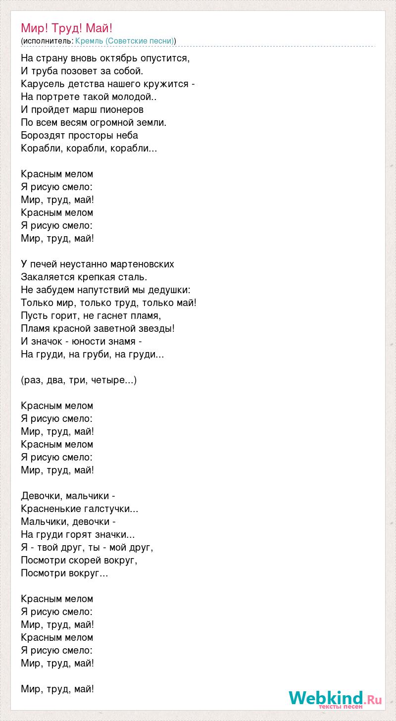 На страну вновь октябрь опустится, И труба позовет за собой. Карусель детства нашего кружится - На портрете такой молодой.. И пройдет марш пионеров По всем весям огромной земли. Бороздят просторы неба Корабли, корабли, корабли... Красным мелом Я рисую смело: Мир, труд, май! Красным мелом Я рисую смело: Мир, труд, май! У печей неустанно мартеновских Закаляется крепкая сталь. Не забудем напутствий мы дедушки: Только мир, только труд, только май! Пусть горит, не гаснет пламя, Пламя красной заветной звезды! И значок - юности знамя - На груди, на груби, на груди... (раз, два, три, четыре...) Красным мелом Я рисую смело: Мир, труд, май! Красным мелом Я рисую смело: Мир, труд, май! Девочки, мальчики - Красненькие галстучки... Мальчики, девочки - На груди горят значки... Я - твой друг, ты - мой друг, Посмотри скорей вокруг, Посмотри вокруг... Красным мелом Я рисую смело: Мир, труд, май! Красным мелом Я рисую смело: Мир, труд, май! Мир, труд, май!