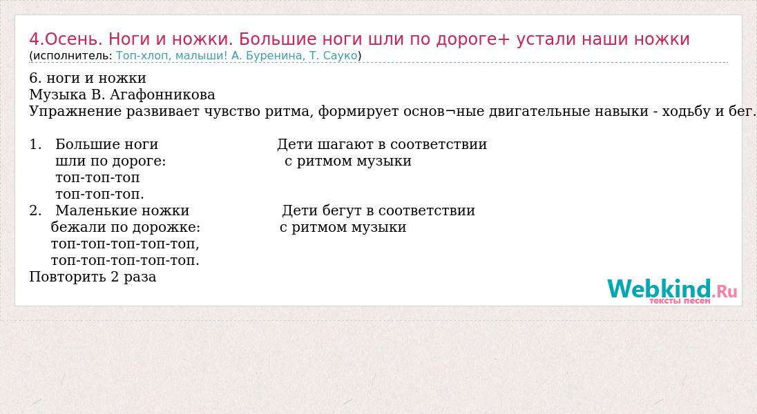Главная→Исполнители→Топ-хлоп, малыши! А. Буренина, Т. Сауко→4.Осень. Ноги и ножки. Большие ноги шли по дороге+ устали наши ножки