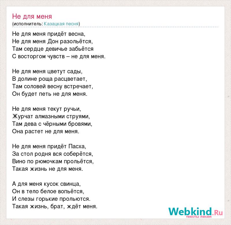 Не для меня придёт весна, Не для меня Дон разольётся, Там сердце девичье забьётся С восторгом чувств – не для меня. Не для меня цветут сады, В долине роща расцветает, Там соловей весну встречает, Он будет петь не для меня. Не для меня текут ручьи, Журчат алмазными струями, Там дева с чёрными бровями, Она растет не для меня. Не для меня придёт Пасха, За стол родня вся соберётся, Вино по рюмочкам прольётся, Такая жизнь не для меня. А для меня кусок свинца, Он в тело белое вопьётся, И слезы горькие прольются. Такая жизнь, брат, ждёт меня.