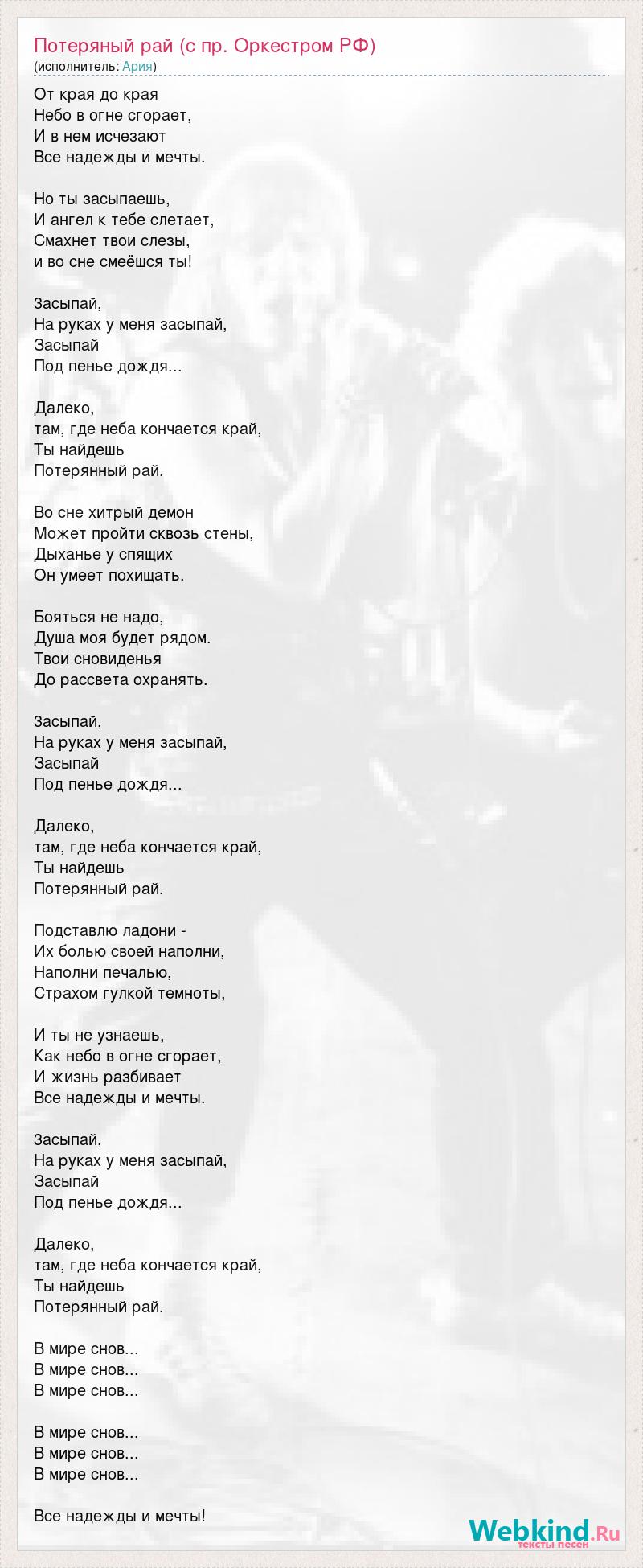 От края до края Небо в огне сгорает, И в нем исчезают Все надежды и мечты. Но ты засыпаешь, И ангел к тебе слетает, Смахнет твои слезы, и во сне смеёшся ты! 3асыпай, На руках у меня засыпай, Засыпай Под пенье дождя... Далеко, там, где неба кончается край, Ты найдешь Потерянный рай. Во сне хитрый демон Может пройти сквозь стены, Дыханье у спящих Он умеет похищать. Бояться не надо, Душа моя будет рядом. Твои сновиденья До рассвета охранять. 3асыпай, На руках у меня засыпай, Засыпай Под пенье дождя... Далеко, там, где неба кончается край, Ты найдешь Потерянный рай. Подставлю ладони - Их болью своей наполни, Наполни печалью, Страхом гулкой темноты, И ты не узнаешь, Как небо в огне сгорает, И жизнь разбивает Все надежды и мечты. 3асыпай, На руках у меня засыпай, Засыпай Под пенье дождя... Далеко, там, где неба кончается край, Ты найдешь Потерянный рай. В мире снов... В мире снов... В мире снов... В мире снов... В мире снов... В мире снов... Все надежды и мечты!