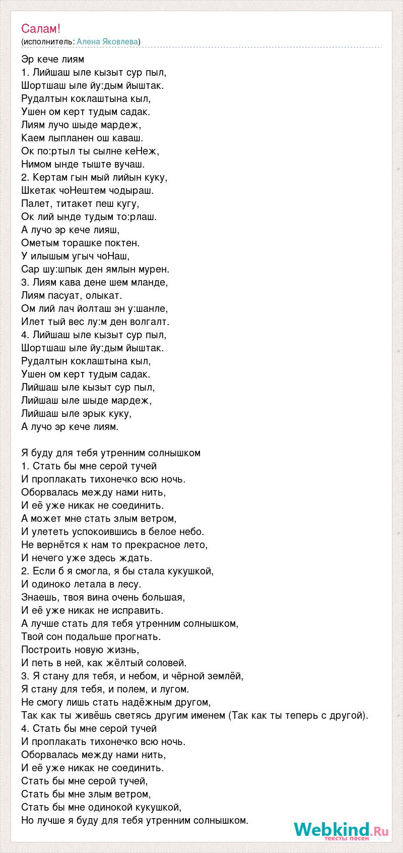 Эр кече лиям 1. Лийшаш ыле кызыт сур пыл, Шортшаш ыле йу:дым йыштак. Рудалтын коклаштына кыл, Ушен ом керт тудым садак. Лиям лучо шыде мардеж, Каем лыпланен ош каваш. Ок по:ртыл ты сылне кеНеж, Нимом ынде тыште вучаш. 2. Кертам гын мый лийын куку, Шкетак чоНештем чодыраш. Палет, титакет пеш кугу, Ок лий ынде тудым то:рлаш. А лучо эр кече лияш, Ометым торашке поктен. У илышым угыч чоНаш, Сар шу:шпык ден ямлын мурен. 3. Лиям кава дене шем мланде, Лиям пасуат, олыкат. Ом лий лач йолташ эн у:шанле, Илет тый вес лу:м ден волгалт. 4. Лийшаш ыле кызыт сур пыл, Шортшаш ыле йу:дым йыштак. Рудалтын коклаштына кыл, Ушен ом керт тудым садак. Лийшаш ыле кызыт сур пыл, Лийшаш ыле шыде мардеж, Лийшаш ыле эрык куку, А лучо эр кече лиям. Я буду для тебя утренним солнышком 1. Стать бы мне серой тучей И проплакать тихонечко всю ночь. Оборвалась между нами нить, И её уже никак не соединить. А может мне стать злым ветром, И улететь успокоившись в белое небо. Не вернётся к нам то прекрасное лето, И нечего уже здесь ждать. 2. Если б я смогла, я бы стала кукушкой, И одиноко летала в лесу. Знаешь, твоя вина очень большая, И её уже никак не исправить. А лучше стать для тебя утренним солнышком, Твой сон подальше прогнать. Построить новую жизнь, И петь в ней, как жёлтый соловей. 3. Я стану для тебя, и небом, и чёрной землёй, Я стану для тебя, и полем, и лугом. Не смогу лишь стать надёжным другом, Так как ты живёшь светясь другим именем (Так как ты теперь с другой). 4. Стать бы мне серой тучей И проплакать тихонечко всю ночь. Оборвалась между нами нить, И её уже никак не соединить. Стать бы мне серой тучей, Стать бы мне злым ветром, Стать бы мне одинокой кукушкой, Но лучше я буду для тебя утренним солнышком.