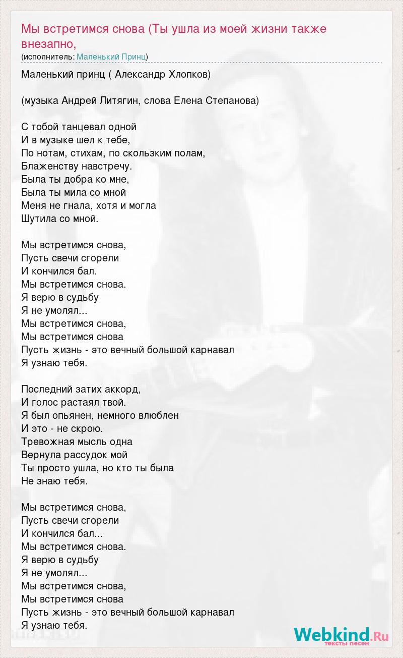 Маленький принц ( Александр Хлопков) (музыка Андрей Литягин, слова Елена Степанова) С тобой танцевал одной И в музыке шел к тебе, По нотам, стихам, по скользким полам, Блаженству навстречу. Была ты добра ко мне, Была ты мила со мной Меня не гнала, хотя и могла Шутила со мной. Мы встретимся снова, Пусть свечи сгорели И кончился бал. Мы встретимся снова. Я верю в судьбу Я не умолял... Мы встретимся снова, Мы встретимся снова Пусть жизнь - это вечный большой карнавал Я узнаю тебя. Последний затих аккорд, И голос растаял твой. Я был опьянен, немного влюблен И это - не скрою. Тревожная мысль одна Вернула рассудок мой Ты просто ушла, но кто ты была Не знаю тебя. Мы встретимся снова, Пусть свечи сгорели И кончился бал... Мы встретимся снова. Я верю в судьбу Я не умолял... Мы встретимся снова, Мы встретимся снова Пусть жизнь - это вечный большой карнавал Я узнаю тебя.
