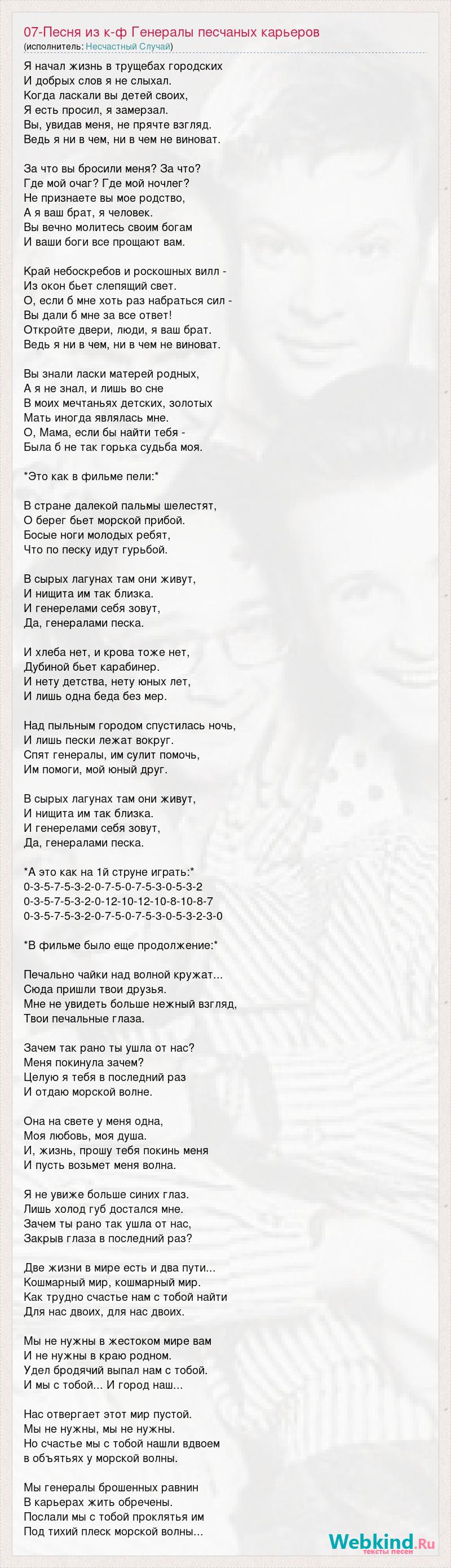 Я начал жизнь в трущебах городских И добрых слов я не слыхал. Kогда ласкали вы детей своих, Я есть просил, я замерзал. Вы, увидав меня, не прячте взгляд. Ведь я ни в чем, ни в чем не виноват. За что вы бросили меня? За что? Где мой очаг? Где мой ночлег? Hе признаете вы мое родство, А я ваш брат, я человек. Вы вечно молитесь своим богам И ваши боги все прощают вам. Kрай небоскребов и роскошных вилл - Из окон бьет слепящий свет. О, если б мне хоть раз набраться сил - Вы дали б мне за все ответ! Откройте двери, люди, я ваш брат. Ведь я ни в чем, ни в чем не виноват. Вы знали ласки матерей родных, А я не знал, и лишь во сне В моих мечтаньях детских, золотых Мать иногда являлась мне. О, Мама, если бы найти тебя - Была б не так горька судьба моя. *Это как в фильме пели:* В стране далекой пальмы шелестят, О берег бьет морской прибой. Босые ноги молодых ребят, Что по песку идут гурьбой. В сырых лагунах там они живут, И нищита им так близка. И генерелами себя зовут, Да, генералами песка. И хлеба нет, и крова тоже нет, Дубиной бьет карабинер. И нету детства, нету юных лет, И лишь одна беда без мер. Hад пыльным городом спустилась ночь, И лишь пески лежат вокруг. Спят генералы, им сулит помочь, Им помоги, мой юный друг. В сырых лагунах там они живут, И нищита им так близка. И генерелами себя зовут, Да, генералами песка. *А это как на 1й стpуне игpать:* 0-3-5-7-5-3-2-0-7-5-0-7-5-3-0-5-3-2 0-3-5-7-5-3-2-0-12-10-12-10-8-10-8-7 0-3-5-7-5-3-2-0-7-5-0-7-5-3-0-5-3-2-3-0 *В фильме было еще продолжение:* Печально чайки над волной кружат... Сюда пришли твои друзья. Мне не увидеть больше нежный взгляд, Твои печальные глаза. Зачем так рано ты ушла от нас? Меня покинула зачем? Целую я тебя в последний раз И отдаю морской волне. Она на свете у меня одна, Моя любовь, моя душа. И, жизнь, прошу тебя покинь меня И пусть возьмет меня волна. Я не увиже больше синих глаз. Лишь холод губ достался мне. Зачем ты рано так ушла от нас, Закрыв глаза в последний раз? Две жизни в мире есть и два пути... Kошмарный мир, кошмарный мир. Kак трудно счастье нам с тобой найти Для нас двоих, для нас двоих. Мы не нужны в жестоком мире вам И не нужны в краю родном. Удел бродячий выпал нам с тобой. И мы с тобой... И город наш... Hас отвергает этот мир пустой. Мы не нужны, мы не нужны. Hо счастье мы с тобой нашли вдвоем в объятьях у морской волны. Мы генералы брошенных равнин В карьерах жить обречены. Послали мы с тобой проклятья им Под тихий плеск морской волны...