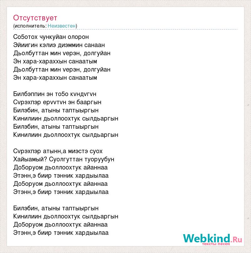Со5отох чункуйан олорон Эйиигин кэлиэ диэммин санаан Дьолбуттан мин vерэн, долгуйан Эн хара-хараххын санаатым Дьолбуттан мин vерэн, долгуйан Эн хара-хараххын санаатым Билбэппин эн то5о кvндvгvн Сvрэхпэр ерvvтvн эн бааргын Билэбин, атыны таптыыргын Кинилиин дьоллоохтук сылдьаргын Билэбин, атыны таптыыргын Кинилиин дьоллоохтук сылдьаргын Сvрэхпэр атынн,а миэстэ суох Хайыамый? Cуолгуттан туоруубун До5оруом дьоллоохтук айаннаа Этэнн,э биир тэнник хардыылаа До5оруом дьоллоохтук айаннаа Этэнн,э биир тэнник хардыылаа Билэбин, атыны таптыыргын Кинилиин дьоллоохтук сылдьаргын До5оруом дьоллоохтук айаннаа Этэнн,э биир тэнник хардыылаа