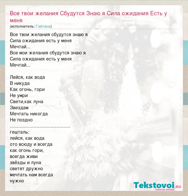 Все твои желания сбудутся знаю я Сила ожидания есть у меня Мечтай... Все мои желания сбудутся знаю я Сила ожидания есть у меня Мечтай... Лейся, как вода В никуда Как огонь, гори Не умри Свети,как луна Звездам Мечтать никогда Не поздно ........................................... гешталь: лейся, как вода ото всюду и всегда как огонь гори, всегда живи звёзды и луна светят дружно мечтать нам всегда нужно