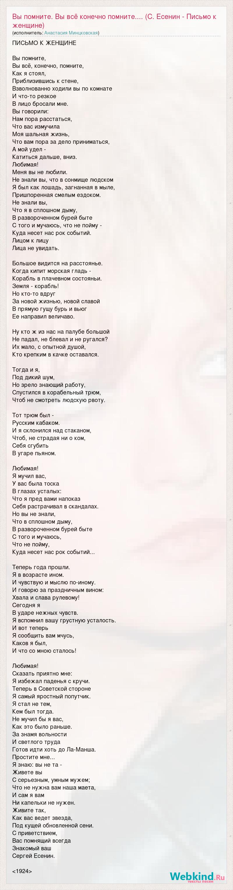 Главная→Исполнители→Анастасия Минцковская→Вы помните. Вы всё конечно помните.... (С. Есенин - Письмо к женщине)