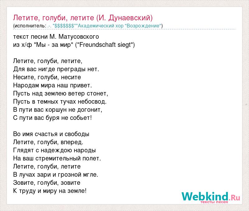 А как ты думаешь, о чем песня "Летите, голуби, летите (И. Дунаевский)" ?