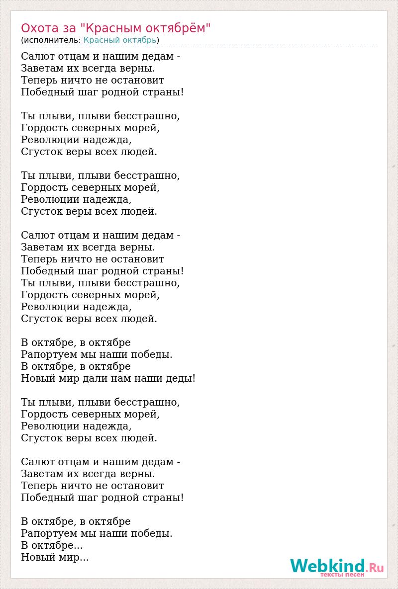 Салют отцам и нашим дедам - Заветам их всегда верны. Теперь ничто не остановит Победный шаг родной страны! Ты плыви, плыви бесстрашно, Гордость северных морей, Революции надежда, Сгусток веры всех людей. Ты плыви, плыви бесстрашно, Гордость северных морей, Революции надежда, Сгусток веры всех людей. Салют отцам и нашим дедам - Заветам их всегда верны. Теперь ничто не остановит Победный шаг родной страны! Ты плыви, плыви бесстрашно, Гордость северных морей, Революции надежда, Сгусток веры всех людей. В октябре, в октябре Рапортуем мы наши победы. В октябре, в октябре Новый мир дали нам наши деды! Ты плыви, плыви бесстрашно, Гордость северных морей, Революции надежда, Сгусток веры всех людей. Салют отцам и нашим дедам - Заветам их всегда верны. Теперь ничто не остановит Победный шаг родной страны! В октябре, в октябре Рапортуем мы наши победы. В октябре... Новый мир...