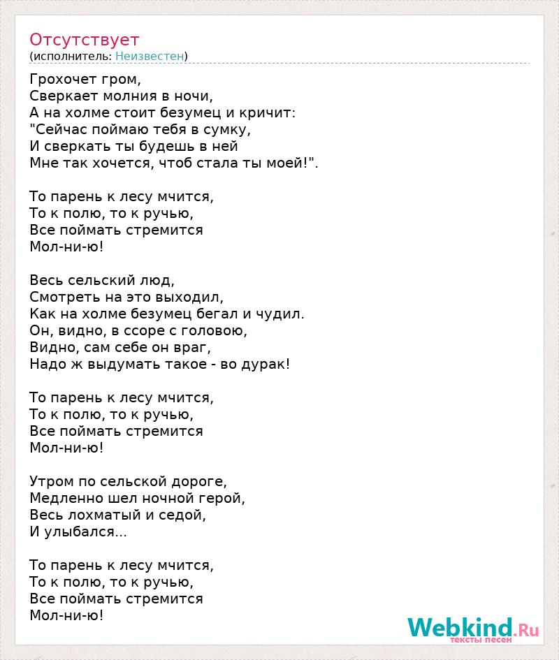 Грохочет гром, Сверкает молния в ночи, А на холме стоит безумец и кричит: "Сейчас поймаю тебя в сумку, И сверкать ты будешь в ней Мне так хочется, чтоб стала ты моей!". То парень к лесу мчится, То к полю, то к ручью, Все поймать стремится Мол-ни-ю! Весь сельский люд, Смотреть на это выходил, Как на холме безумец бегал и чудил. Он, видно, в ссоре с головою, Видно, сам себе он враг, Надо ж выдумать такое - во дурак! То парень к лесу мчится, То к полю, то к ручью, Все поймать стремится Мол-ни-ю! Утром по сельской дороге, Медленно шел ночной герой, Весь лохматый и седой, И улыбался... То парень к лесу мчится, То к полю, то к ручью, Все поймать стремится Мол-ни-ю!