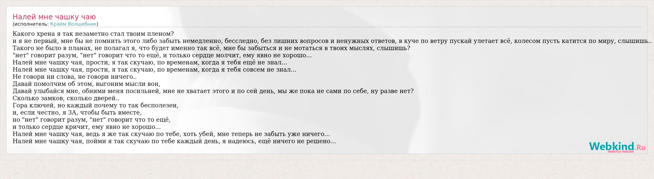 Какого хрена я так незаметно стал твоим пленом? и я не первый, мне бы не помнить этого либо забыть немедленно, бесследно, без лишних вопросов и ненужных ответов, в куче по ветру пускай улетает всё, колесом пусть катится по миру, слышишь.. Такого не было в планах, не полагал я, что будет именно так всё, мне бы забыться и не мотаться в твоих мыслях, слышишь? "нет" говорит разум, "нет" говорит что то ещё, и только сердце молчит, ему явно не хорошо... Налей мне чашку чая, прости, я так скучаю, по временам, когда я тебя ещё не знал... Налей мне чашку чая, прости, я так скучаю, по временам, когда я тебя совсем не знал... Не говори ни слова, не говори ничего.. Давай помолчим об этом, выгоним мысли вон, Давай улыбайся мне, обними меня посильней, мне не хватает этого и по сей день, мы же пока не сами по себе, ну разве нет? Сколько замков, сколько дверей.. Гора ключей, но каждый почему то так бесполезен, и, если честно, я ЗА, чтобы быть вместе, но "нет" говорит разум, "нет" говорит что то ещё, и только сердце кричит, ему явно не хорошо... Налей мне чашку чая, ведь я же так скучаю по тебе, хоть убей, мне теперь не забыть уже ничего... Налей мне чашку чая, пойми я так скучаю по тебе каждый день, я надеюсь, ещё ничего не решено...