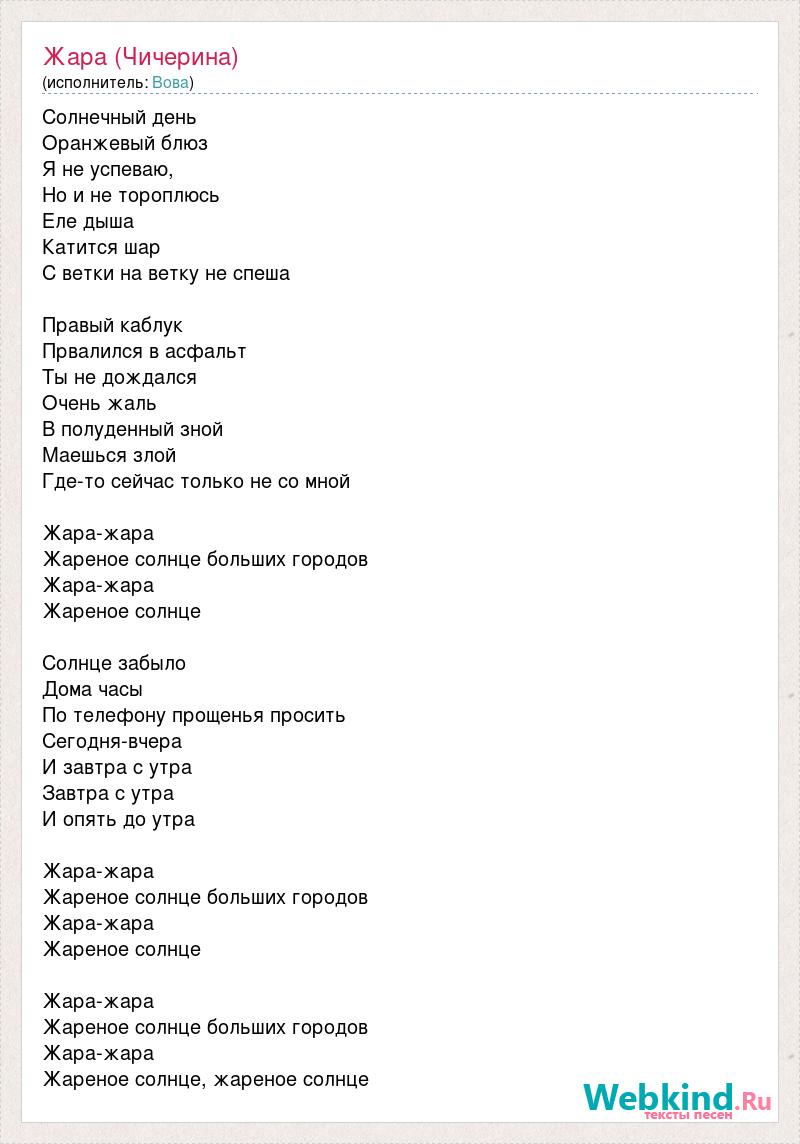Солнечный день Оранжевый блюз Я не успеваю, Но и не тороплюсь Еле дыша Катится шар С ветки на ветку не спеша Правый каблук Првалился в асфальт Ты не дождался Очень жаль В полуденный зной Маешься злой Где-то сейчас только не со мной Жара-жара Жареное солнце больших городов Жара-жара Жареное солнце Солнце забыло Дома часы По телефону прощенья просить Сегодня-вчера И завтра с утра Завтра с утра И опять до утра Жара-жара Жареное солнце больших городов Жара-жара Жареное солнце Жара-жара Жареное солнце больших городов Жара-жара Жареное солнце, жареное солнце