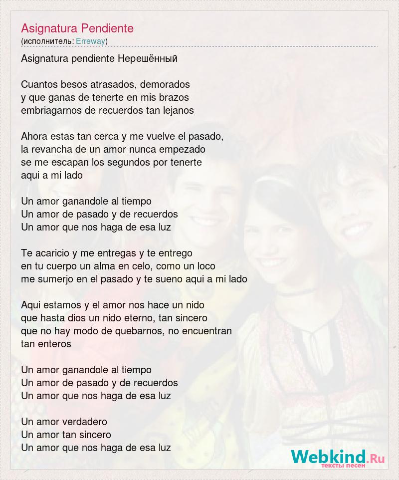 Asignatura pendiente Нерешённый Cuantos besos atrasados, demorados y que ganas de tenerte en mis brazos embriagarnos de recuerdos tan lejanos Ahora estas tan cerca y me vuelve el pasado, la revancha de un amor nunca empezado se me escapan los segundos por tenerte aqui a mi lado Un amor ganandole al tiempo Un amor de pasado y de recuerdos Un amor que nos haga de esa luz Te acaricio y me entregas y te entrego en tu cuerpo un alma en celo, como un loco me sumerjo en el pasado y te sueno aqui a mi lado Aqui estamos y el amor nos hace un nido que hasta dios un nido eterno, tan sincero que no hay modo de quebarnos, no encuentran tan enteros Un amor ganandole al tiempo Un amor de pasado y de recuerdos Un amor que nos haga de esa luz Un amor verdadero Un amor tan sincero Un amor que nos haga de esa luz