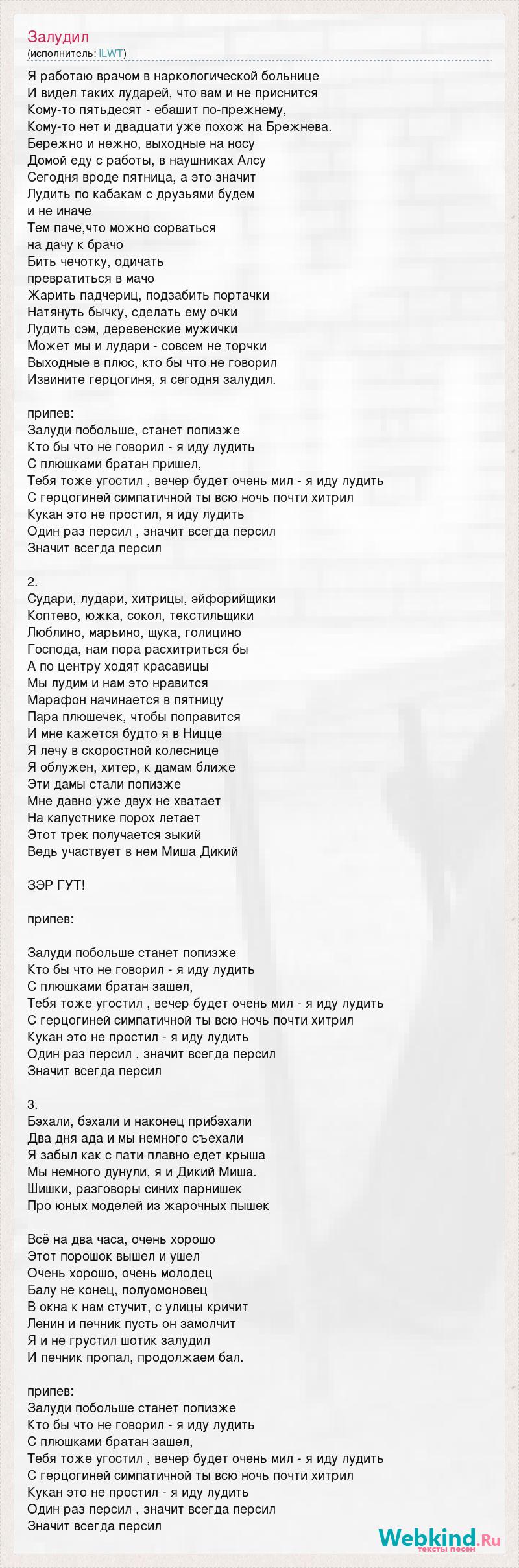 Я работаю врачом в наркологической больнице И видел таких лударей, что вам и не приснится Кому-то пятьдесят - ебашит по-прежнему, Кому-то нет и двадцати уже похож на Брежнева. Бережно и нежно, выходные на носу Домой еду с работы, в наушниках Алсу Сегодня вроде пятница, а это значит Лудить по кабакам с друзьями будем и не иначе Тем паче,что можно сорваться на дачу к брачо Бить чечотку, одичать превратиться в мачо Жарить падчериц, подзабить портачки Натянуть бычку, сделать ему очки Лудить сэм, деревенские мужички Может мы и лудари - совсем не торчки Выходные в плюс, кто бы что не говорил Извините герцогиня, я сегодня залудил. припев: Залуди побольше, станет попизже Кто бы что не говорил - я иду лудить С плюшками братан пришел, Тебя тоже угостил , вечер будет очень мил - я иду лудить С герцогиней симпатичной ты всю ночь почти хитрил Кукан это не простил, я иду лудить Один раз персил , значит всегда персил Значит всегда персил 2. Судари, лудари, хитрицы, эйфорийщики Коптево, южка, сокол, текстильщики Люблино, марьино, щука, голицино Господа, нам пора расхитриться бы А по центру ходят красавицы Мы лудим и нам это нравится Марафон начинается в пятницу Пара плюшечек, чтобы поправится И мне кажется будто я в Ницце Я лечу в скоростной колеснице Я облужен, хитер, к дамам ближе Эти дамы стали попизже Мне давно уже двух не хватает На капустнике порох летает Этот трек получается зыкий Ведь участвует в нем Миша Дикий ЗЭР ГУТ! припев: Залуди побольше станет попизже Кто бы что не говорил - я иду лудить С плюшками братан зашел, Тебя тоже угостил , вечер будет очень мил - я иду лудить С герцогиней симпатичной ты всю ночь почти хитрил Кукан это не простил - я иду лудить Один раз персил , значит всегда персил Значит всегда персил 3. Бэхали, бэхали и наконец прибэхали Два дня ада и мы немного съехали Я забыл как с пати плавно едет крыша Мы немного дунули, я и Дикий Миша. Шишки, разговоры синих парнишек Про юных моделей из жарочных пышек Всё на два часа, очень хорошо Этот порошок вышел и ушел Очень хорошо, очень молодец Балу не конец, полуомоновец В окна к нам стучит, с улицы кричит Ленин и печник пусть он замолчит Я и не грустил шотик залудил И печник пропал, продолжаем бал. припев: Залуди побольше станет попизже Кто бы что не говорил - я иду лудить С плюшками братан зашел, Тебя тоже угостил , вечер будет очень мил - я иду лудить С герцогиней симпатичной ты всю ночь почти хитрил Кукан это не простил - я иду лудить Один раз персил , значит всегда персил Значит всегда персил