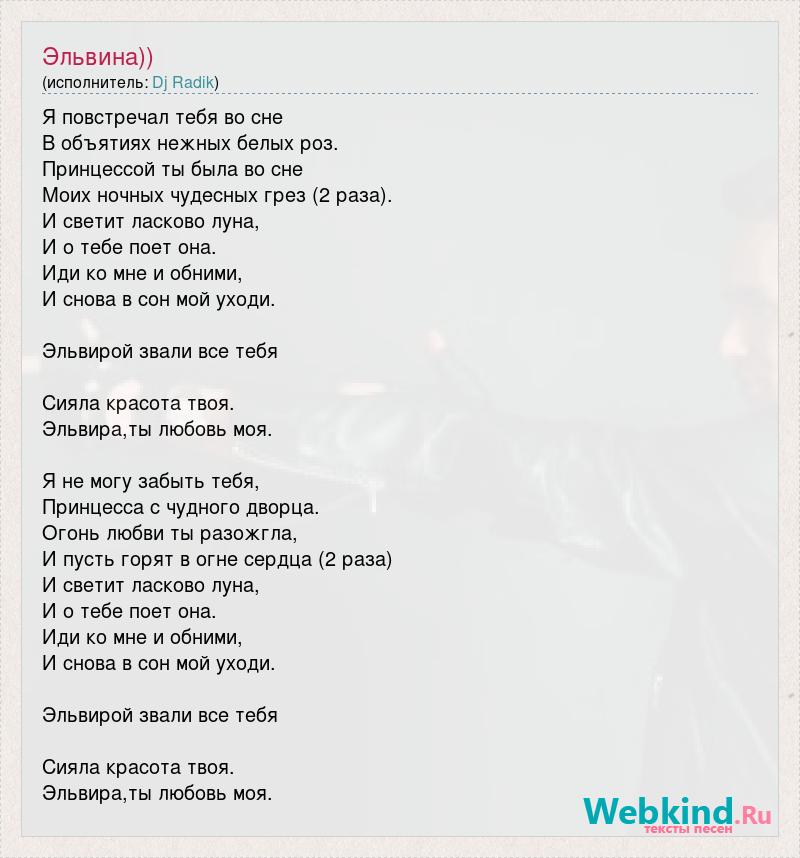 Я повстречал тебя во сне В объятиях нежных белых роз. Принцессой ты была во сне Моих ночных чудесных грез (2 раза). И светит ласково луна, И о тебе поет она. Иди ко мне и обними, И снова в сон мой уходи. Эльвирой звали все тебя Сияла красота твоя. Эльвира,ты любовь моя. Я не могу забыть тебя, Принцесса с чудного дворца. Огонь любви ты разожгла, И пусть горят в огне сердца (2 раза) И светит ласково луна, И о тебе поет она. Иди ко мне и обними, И снова в сон мой уходи. Эльвирой звали все тебя Сияла красота твоя. Эльвира,ты любовь моя.