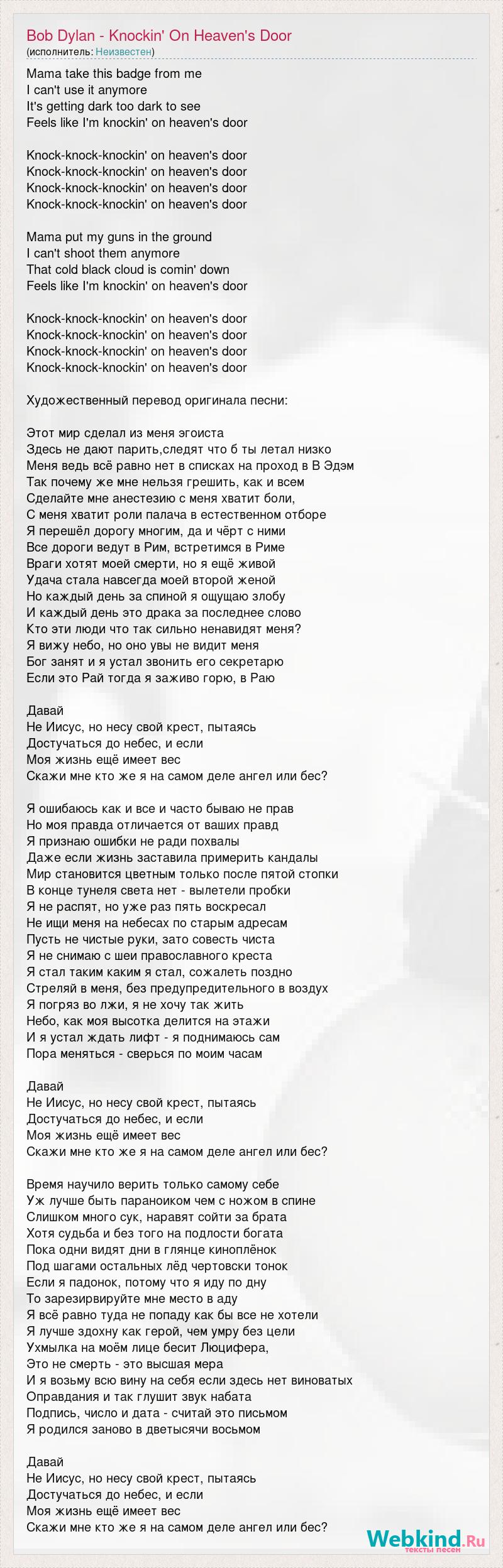 Mama take this badge from me I can't use it anymore It's getting dark too dark to see Feels like I'm knockin' on heaven's door Knock-knock-knockin' on heaven's door Knock-knock-knockin' on heaven's door Knock-knock-knockin' on heaven's door Knock-knock-knockin' on heaven's door Mama put my guns in the ground I can't shoot them anymore That cold black cloud is comin' down Feels like I'm knockin' on heaven's door Knock-knock-knockin' on heaven's door Knock-knock-knockin' on heaven's door Knock-knock-knockin' on heaven's door Knock-knock-knockin' on heaven's door Художественный перевод оригинала песни: Этот мир сделал из меня эгоиста Здесь не дают парить,следят что б ты летал низко Меня ведь всё равно нет в списках на проход в В Эдэм Так почему же мне нельзя грешить, как и всем Сделайте мне анестезию с меня хватит боли, С меня хватит роли палача в естественном отборe Я перешёл дорогу многим, да и чёрт с ними Все дороги ведут в Рим, встретимся в Риме Враги хотят моей смерти, но я ещё живой Удача стала навсегда моей второй женой Но каждый день за спиной я ощущаю злобу И каждый день это драка за последнее слово Кто эти люди что так сильно ненавидят меня? Я вижу небо, но оно увы не видит меня Бог занят и я устал звонить его секретарю Если это Рай тогда я заживо горю, в Раю Давай Не Иисус, но несу свой крест, пытаясь Достучаться до небес, и если Моя жизнь ещё имеет вес Скажи мне кто же я на самом деле ангел или бес? Я ошибаюсь как и все и часто бываю не прав Но моя правда отличается от ваших правд Я признаю ошибки не ради похвалы Даже если жизнь заставила примерить кандалы Мир становится цветным только после пятой стопки В конце тунеля света нет - вылетели пробки Я не распят, но уже раз пять воскресал Не ищи меня на небесах по старым адресам Пусть не чистые руки, зато совесть чиста Я не снимаю с шеи православного креста Я стал таким каким я стал, сожалеть поздно Стреляй в меня, без предупредительного в воздух Я погряз во лжи, я не хочу так жить Небо, как моя высотка делится на этажи И я устал ждать лифт - я поднимаюсь сам Пора меняться - сверься по моим часам Давай Не Иисус, но несу свой крест, пытаясь Достучаться до небес, и если Моя жизнь ещё имеет вес Скажи мне кто же я на самом деле ангел или бес? Время научило верить только самому себе Уж лучше быть параноиком чем с ножом в спине Слишком много сук, наравят сойти за брата Хотя судьба и без того на подлости богата Пока одни видят дни в глянце киноплёнок Под шагами остальных лёд чертовски тонок Если я падонок, потому что я иду по дну То зарезирвируйте мне место в аду Я всё равно туда не попаду как бы все не хотели Я лучше здохну как герой, чем умру без цели Ухмылка на моём лице бесит Люцифера, Это не смерть - это высшая мера И я возьму всю вину на себя если здесь нет виноватых Оправдания и так глушит звук набата Подпись, число и дата - считай это письмом Я родился заново в дветысячи восьмом Давай Не Иисус, но несу свой крест, пытаясь Достучаться до небес, и если Моя жизнь ещё имеет вес Скажи мне кто же я на самом деле ангел или бес?