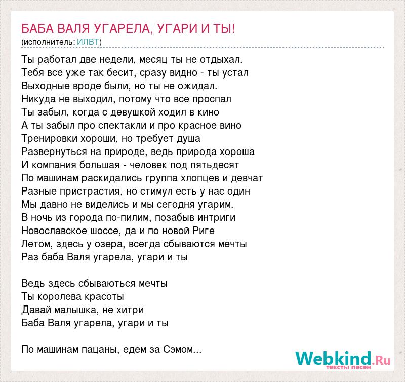 Ты работал две недели, месяц ты не отдыхал. Тебя все уже так бесит, сразу видно - ты устал Выходные вроде были, но ты не ожидал. Никуда не выходил, потому что все проспал Ты забыл, когда с девушкой ходил в кино А ты забыл про спектакли и про красное вино Тренировки хороши, но требует душа Развернуться на природе, ведь природа хороша И компания большая - человек под пятьдесят По машинам раскидались группа хлопцев и девчат Разные пристрастия, но стимул есть у нас один Мы давно не виделись и мы сегодня угарим. В ночь из города по-пилим, позабыв интриги Новославское шоссе, да и по новой Риге Летом, здесь у озера, всегда сбываются мечты Раз баба Валя угарела, угари и ты Ведь здесь сбываються мечты Ты королева красоты Давай малышка, не хитри Баба Валя угарела, угари и ты По машинам пацаны, едем за Сэмом...