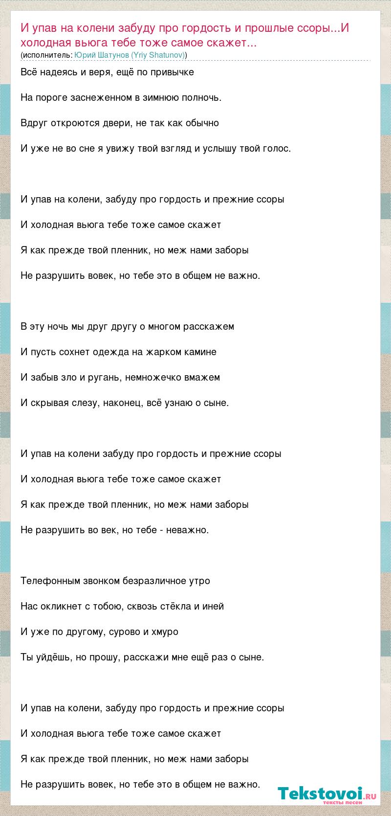 Главная→Исполнители→Юрий Шатунов (Yriy Shatunov)→И упав на колени забуду про гордость и прошлые ссоры...И холодная вьюга тебе тож