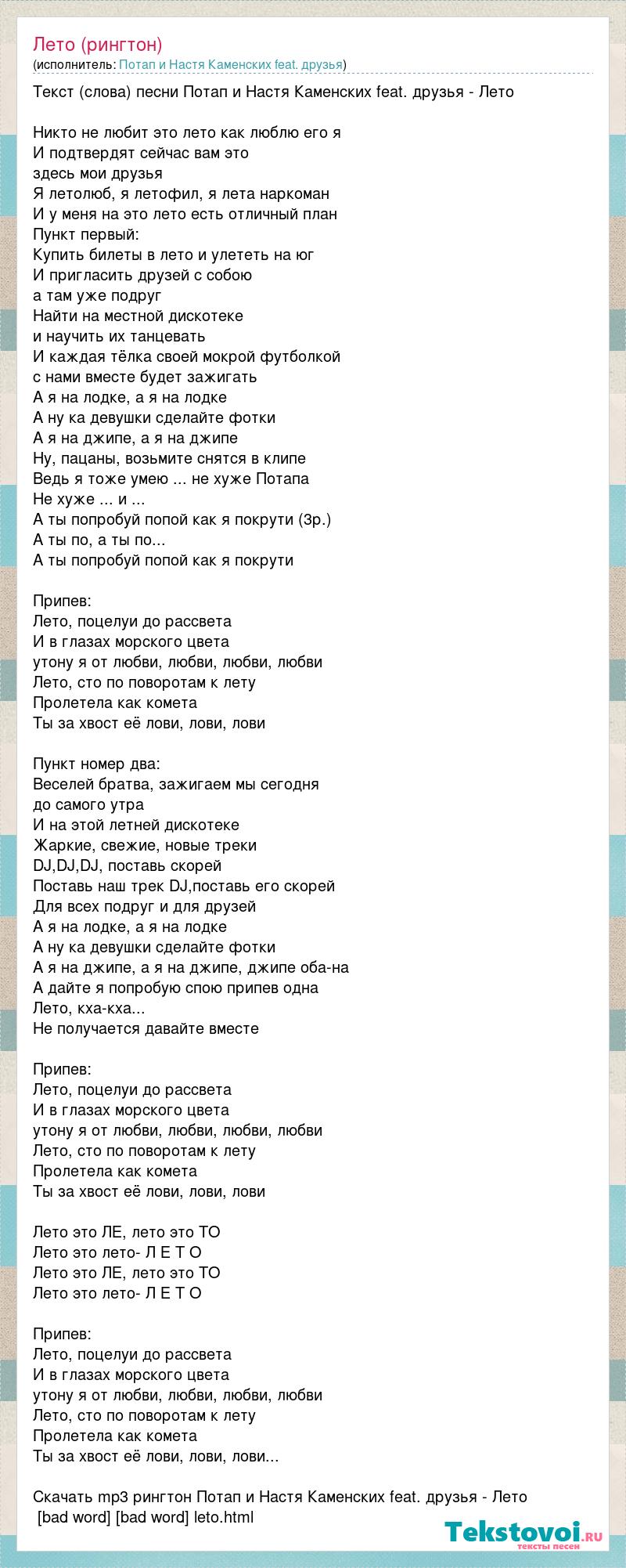 Текст (слова) песни Потап и Настя Каменских feat. друзья - Лето Никто не любит это лето как люблю его я И подтвердят сейчас вам это здесь мои друзья Я летолюб, я летофил, я лета наркоман И у меня на это лето есть отличный план Пункт первый: Купить билеты в лето и улететь на юг И пригласить друзей с собою а там уже подруг Найти на местной дискотеке и научить их танцевать И каждая тёлка своей мокрой футболкой с нами вместе будет зажигать А я на лодке, а я на лодке А ну ка девушки сделайте фотки А я на джипе, а я на джипе Ну, пацаны, возьмите снятся в клипе Ведь я тоже умею ... не хуже Потапа Не хуже ... и ... А ты попробуй попой как я покрути (3р.) А ты по, а ты по... А ты попробуй попой как я покрути Припев: Лето, поцелуи до рассвета И в глазах морского цвета утону я от любви, любви, любви, любви Лето, сто по поворотам к лету Пролетела как комета Ты за хвост её лови, лови, лови Пункт номер два: Веселей братва, зажигаем мы сегодня до самого утра И на этой летней дискотеке Жаркие, свежие, новые треки DJ,DJ,DJ, поставь скорей Поставь наш трек DJ,поставь его скорей Для всех подруг и для друзей А я на лодке, а я на лодке А ну ка девушки сделайте фотки А я на джипе, а я на джипе, джипе оба-на А дайте я попробую спою припев одна Лето, кха-кха... Не получается давайте вместе Припев: Лето, поцелуи до рассвета И в глазах морского цвета утону я от любви, любви, любви, любви Лето, сто по поворотам к лету Пролетела как комета Ты за хвост её лови, лови, лови Лето это ЛЕ, лето это ТО Лето это лето- Л Е Т О Лето это ЛЕ, лето это ТО Лето это лето- Л Е Т О Припев: Лето, поцелуи до рассвета И в глазах морского цвета утону я от любви, любви, любви, любви Лето, сто по поворотам к лету Пролетела как комета Ты за хвост её лови, лови, лови... Скачать mp3 рингтон Потап и Настя Каменских feat. друзья - Лето [bad word] [bad word] leto.html