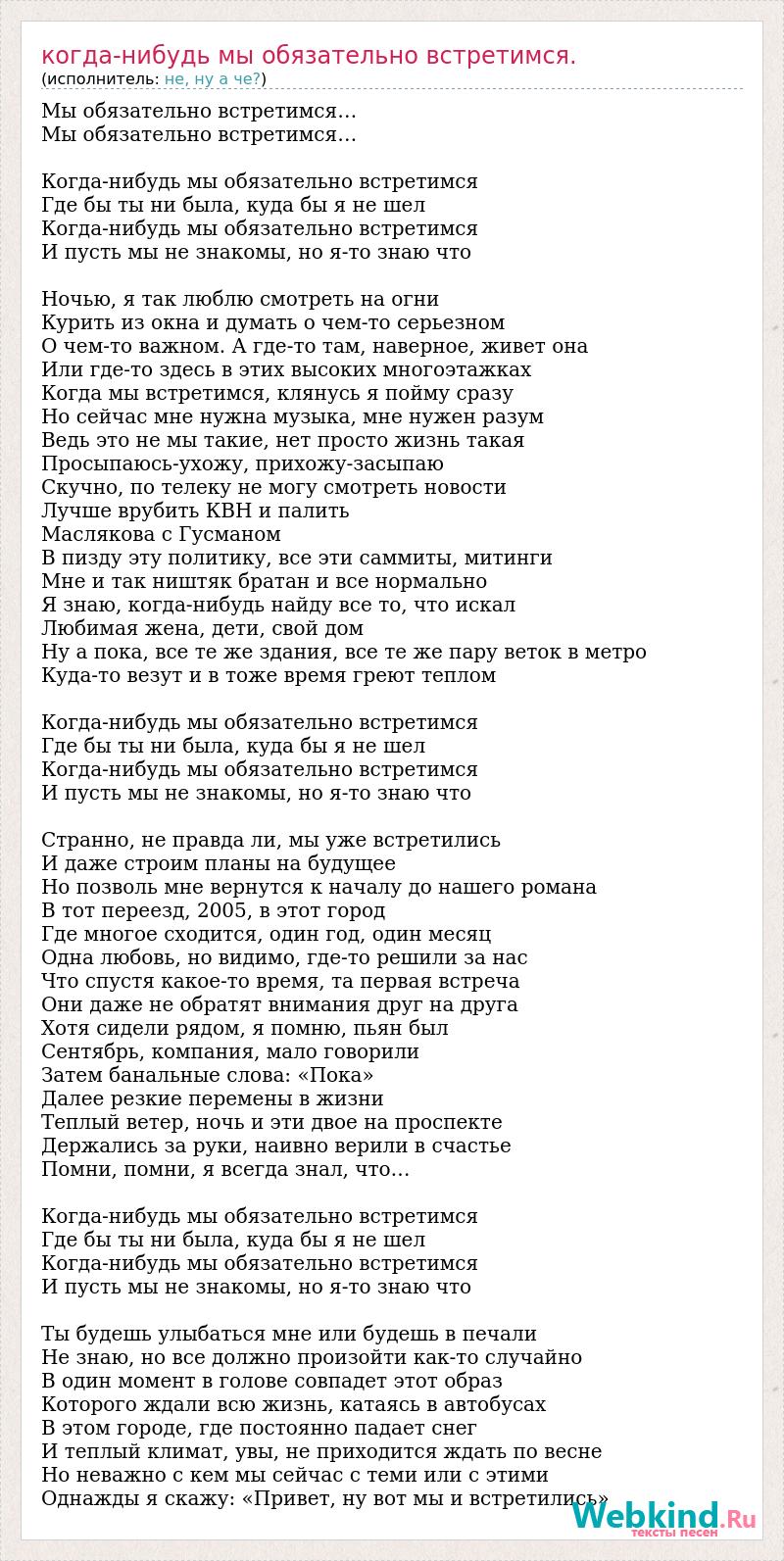 Мы обязательно встретимся… Мы обязательно встретимся… Когда-нибудь мы обязательно встретимся Где бы ты ни была, куда бы я не шел Когда-нибудь мы обязательно встретимся И пусть мы не знакомы, но я-то знаю что Ночью, я так люблю смотреть на огни Курить из окна и думать о чем-то серьезном О чем-то важном. А где-то там, наверное, живет она Или где-то здесь в этих высоких многоэтажках Когда мы встретимся, клянусь я пойму сразу Но сейчас мне нужна музыка, мне нужен разум Ведь это не мы такие, нет просто жизнь такая Просыпаюсь-ухожу, прихожу-засыпаю Скучно, по телеку не могу смотреть новости Лучше врубить КВН и палить Маслякова с Гусманом В пизду эту политику, все эти саммиты, митинги Мне и так ништяк братан и все нормально Я знаю, когда-нибудь найду все то, что искал Любимая жена, дети, свой дом Ну а пока, все те же здания, все те же пару веток в метро Куда-то везут и в тоже время греют теплом Когда-нибудь мы обязательно встретимся Где бы ты ни была, куда бы я не шел Когда-нибудь мы обязательно встретимся И пусть мы не знакомы, но я-то знаю что Странно, не правда ли, мы уже встретились И даже строим планы на будущее Но позволь мне вернутся к началу до нашего романа В тот переезд, 2005, в этот город Где многое сходится, один год, один месяц Одна любовь, но видимо, где-то решили за нас Что спустя какое-то время, та первая встреча Они даже не обратят внимания друг на друга Хотя сидели рядом, я помню, пьян был Сентябрь, компания, мало говорили Затем банальные слова: «Пока» Далее резкие перемены в жизни Теплый ветер, ночь и эти двое на проспекте Держались за руки, наивно верили в счастье Помни, помни, я всегда знал, что… Когда-нибудь мы обязательно встретимся Где бы ты ни была, куда бы я не шел Когда-нибудь мы обязательно встретимся И пусть мы не знакомы, но я-то знаю что Ты будешь улыбаться мне или будешь в печали Не знаю, но все должно произойти как-то случайно В один момент в голове совпадет этот образ Которого ждали всю жизнь, катаясь в автобусах В этом городе, где постоянно падает снег И теплый климат, увы, не приходится ждать по весне Но неважно с кем мы сейчас с теми или с этими Однажды я скажу: «Привет, ну вот мы и встретились»