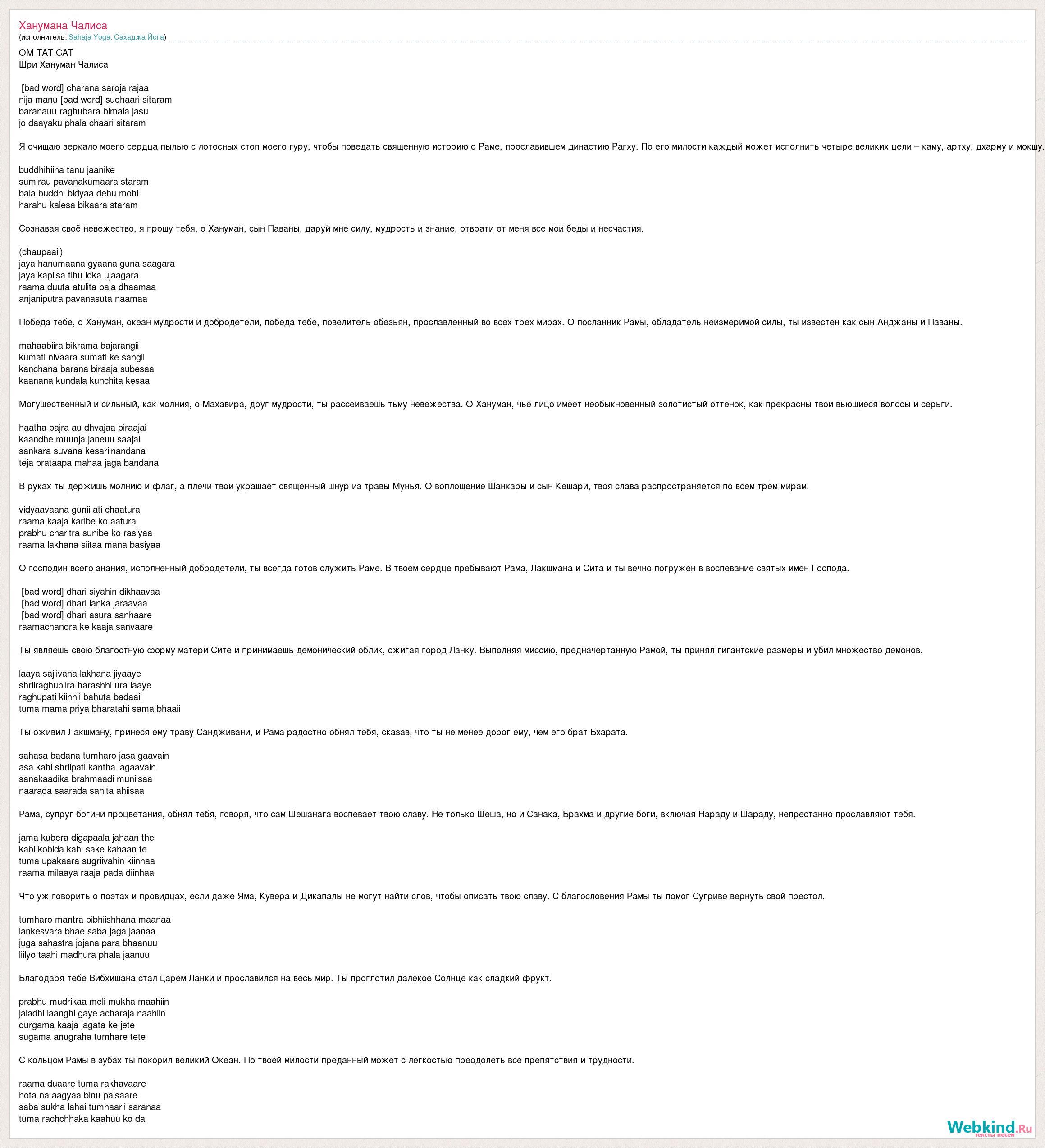 ОМ ТАТ САТ Шри Хануман Чалиса [bad word] charana saroja rajaa nija manu [bad word] sudhaari sitaram baranauu raghubara bimala jasu jo daayaku phala chaari sitaram Я очищаю зеркало моего сердца пылью с лотосных стоп моего гуру, чтобы поведать священную историю о Раме, прославившем династию Рагху. По его милости каждый может исполнить четыре великих цели – каму, артху, дхарму и мокшу. buddhihiina tanu jaanike sumirau pavanakumaara staram bala buddhi bidyaa dehu mohi harahu kalesa bikaara staram Сознавая своё невежество, я прошу тебя, о Хануман, сын Паваны, даруй мне силу, мудрость и знание, отврати от меня все мои беды и несчастия. (chaupaaii) jaya hanumaana gyaana guna saagara jaya kapiisa tihu loka ujaagara raama duuta atulita bala dhaamaa anjaniputra pavanasuta naamaa Победа тебе, о Хануман, океан мудрости и добродетели, победа тебе, повелитель обезьян, прославленный во всех трёх мирах. О посланник Рамы, обладатель неизмеримой силы, ты известен как сын Анджаны и Паваны. mahaabiira bikrama bajarangii kumati nivaara sumati ke sangii kanchana barana biraaja subesaa kaanana kundala kunchita kesaa Могущественный и сильный, как молния, о Махавира, друг мудрости, ты рассеиваешь тьму невежества. О Хануман, чьё лицо имеет необыкновенный золотистый оттенок, как прекрасны твои вьющиеся волосы и серьги. haatha bajra au dhvajaa biraajai kaandhe muunja janeuu saajai sankara suvana kesariinandana teja prataapa mahaa jaga bandana В руках ты держишь молнию и флаг, а плечи твои украшает священный шнур из травы Мунья. О воплощение Шанкары и сын Кешари, твоя слава распространяется по всем трём мирам. vidyaavaana gunii ati chaatura raama kaaja karibe ko aatura prabhu charitra sunibe ko rasiyaa raama lakhana siitaa mana basiyaa О господин всего знания, исполненный добродетели, ты всегда готов служить Раме. В твоём сердце пребывают Рама, Лакшмана и Сита и ты вечно погружён в воспевание святых имён Господа. [bad word] dhari siyahin dikhaavaa [bad word] dhari lanka jaraavaa [bad word] dhari asura sanhaare raamachandra ke kaaja sanvaare Ты являешь свою благостную форму матери Сите и принимаешь демонический облик, сжигая город Ланку. Выполняя миссию, предначертанную Рамой, ты принял гигантские размеры и убил множество демонов. laaya sajiivana lakhana jiyaaye shriiraghubiira harashhi ura laaye raghupati kiinhii bahuta badaaii tuma mama priya bharatahi sama bhaaii Ты оживил Лакшману, принеся ему траву Сандживани, и Рама радостно обнял тебя, сказав, что ты не менее дорог ему, чем его брат Бхарата. sahasa badana tumharo jasa gaavain asa kahi shriipati kantha lagaavain sanakaadika brahmaadi muniisaa naarada saarada sahita ahiisaa Рама, супруг богини процветания, обнял тебя, говоря, что сам Шешанага воспевает твою славу. Не только Шеша, но и Санака, Брахма и другие боги, включая Нараду и Шараду, непрестанно прославляют тебя. jama kubera digapaala jahaan the kabi kobida kahi sake kahaan te tuma upakaara sugriivahin kiinhaa raama milaaya raaja pada diinhaa Что уж говорить о поэтах и провидцах, если даже Яма, Кувера и Дикапалы не могут найти слов, чтобы описать твою славу. С благословения Рамы ты помог Сугриве вернуть свой престол. tumharo mantra bibhiishhana maanaa lankesvara bhae saba jaga jaanaa juga sahastra jojana para bhaanuu liilyo taahi madhura phala jaanuu Благодаря тебе Вибхишана стал царём Ланки и прославился на весь мир. Ты проглотил далёкое Солнце как сладкий фрукт. prabhu mudrikaa meli mukha maahiin jaladhi laanghi gaye acharaja naahiin durgama kaaja jagata ke jete sugama anugraha tumhare tete С кольцом Рамы в зубах ты покорил великий Океан. По твоей милости преданный может с лёгкостью преодолеть все препятствия и трудности. raama duaare tuma rakhavaare hota na aagyaa binu paisaare saba sukha lahai tumhaarii saranaa tuma rachchhaka kaahuu ko da