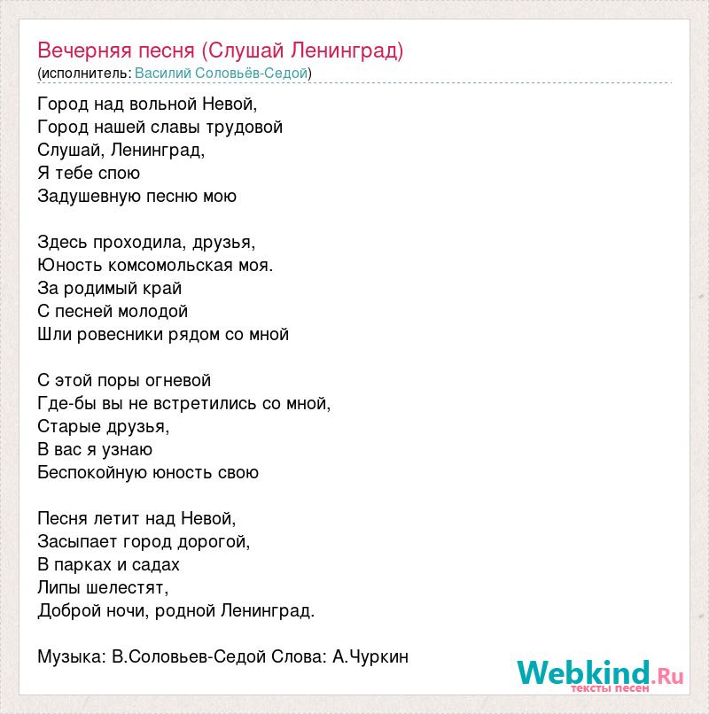 Город над вольной Невой, Город нашей славы трудовой Слушай, Ленинград, Я тебе спою Задушевную песню мою Здесь проходила, друзья, Юность комсомольская моя. За родимый край С песней молодой Шли ровесники рядом со мной С этой поры огневой Где-бы вы не встретились со мной, Старые друзья, В вас я узнаю Беспокойную юность свою Песня летит над Невой, Засыпает город дорогой, В парках и садах Липы шелестят, Доброй ночи, родной Ленинград. Музыка: В.Соловьев-Седой Слова: А.Чуркин