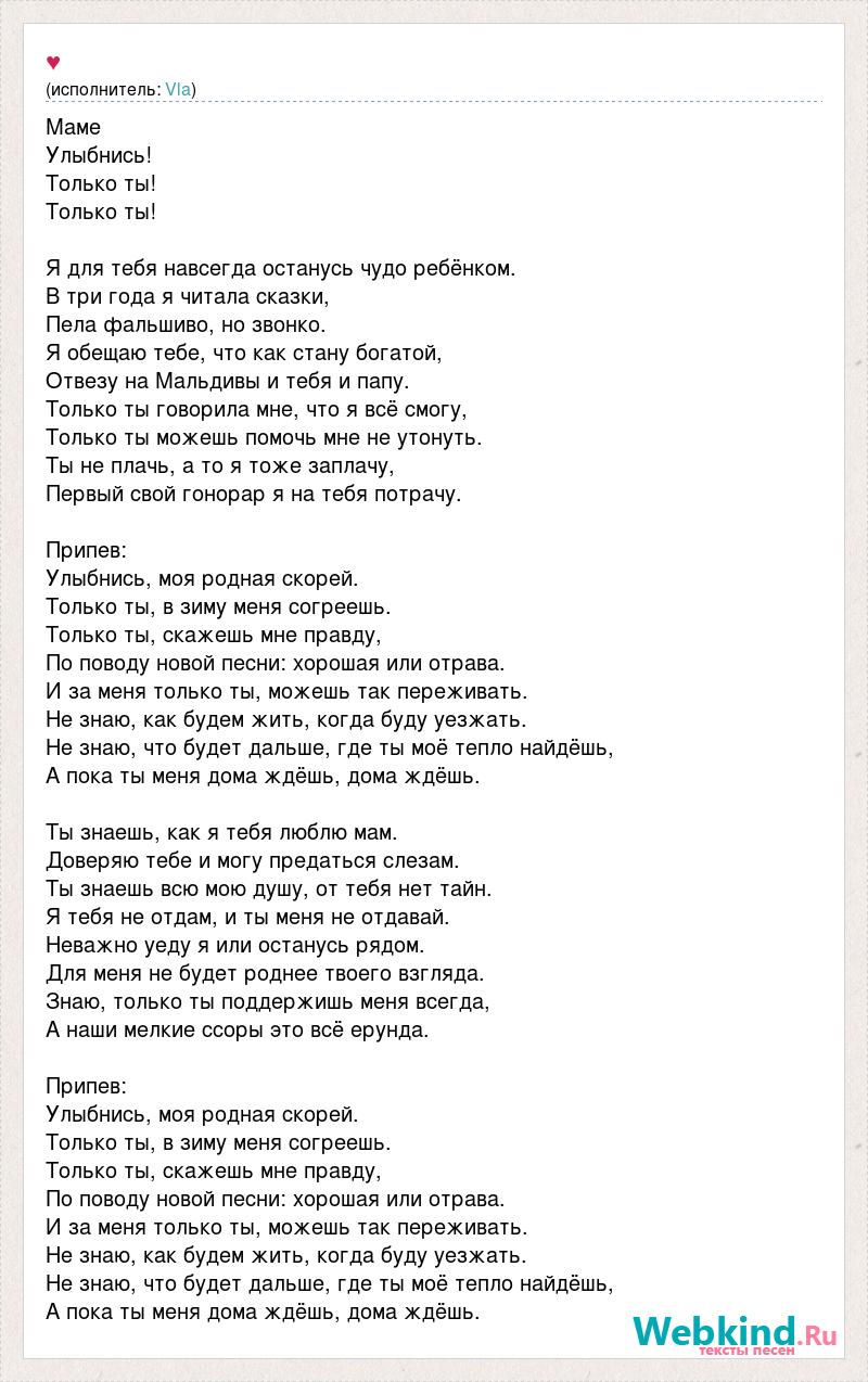 Маме Улыбнись! Только ты! Только ты! Я для тебя навсегда останусь чудо ребёнком. В три года я читала сказки, Пела фальшиво, но звонко. Я обещаю тебе, что как стану богатой, Отвезу на Мальдивы и тебя и папу. Только ты говорила мне, что я всё смогу, Только ты можешь помочь мне не утонуть. Ты не плачь, а то я тоже заплачу, Первый свой гонорар я на тебя потрачу. Припев: Улыбнись, моя родная скорей. Только ты, в зиму меня согреешь. Только ты, скажешь мне правду, По поводу новой песни: хорошая или отрава. И за меня только ты, можешь так переживать. Не знаю, как будем жить, когда буду уезжать. Не знаю, что будет дальше, где ты моё тепло найдёшь, А пока ты меня дома ждёшь, дома ждёшь. Ты знаешь, как я тебя люблю мам. Доверяю тебе и могу предаться слезам. Ты знаешь всю мою душу, от тебя нет тайн. Я тебя не отдам, и ты меня не отдавай. Неважно уеду я или останусь рядом. Для меня не будет роднее твоего взгляда. Знаю, только ты поддержишь меня всегда, А наши мелкие ссоры это всё ерунда. Припев: Улыбнись, моя родная скорей. Только ты, в зиму меня согреешь. Только ты, скажешь мне правду, По поводу новой песни: хорошая или отрава. И за меня только ты, можешь так переживать. Не знаю, как будем жить, когда буду уезжать. Не знаю, что будет дальше, где ты моё тепло найдёшь, А пока ты меня дома ждёшь, дома ждёшь.