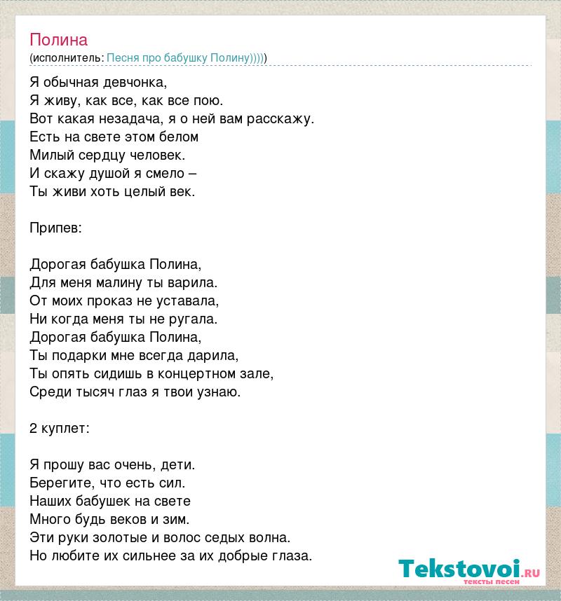 Я обычная девчонка, Я живу, как все, как все пою. Вот какая незадача, я о ней вам расскажу. Есть на свете этом белом Милый сердцу человек. И скажу душой я смело – Ты живи хоть целый век. Припев: Дорогая бабушка Полина, Для меня малину ты варила. От моих проказ не уставала, Ни когда меня ты не ругала. Дорогая бабушка Полина, Ты подарки мне всегда дарила, Ты опять сидишь в концертном зале, Среди тысяч глаз я твои узнаю. 2 куплет: Я прошу вас очень, дети. Берегите, что есть сил. Наших бабушек на свете Много будь веков и зим. Эти руки золотые и волос седых волна. Но любите их сильнее за их добрые глаза.