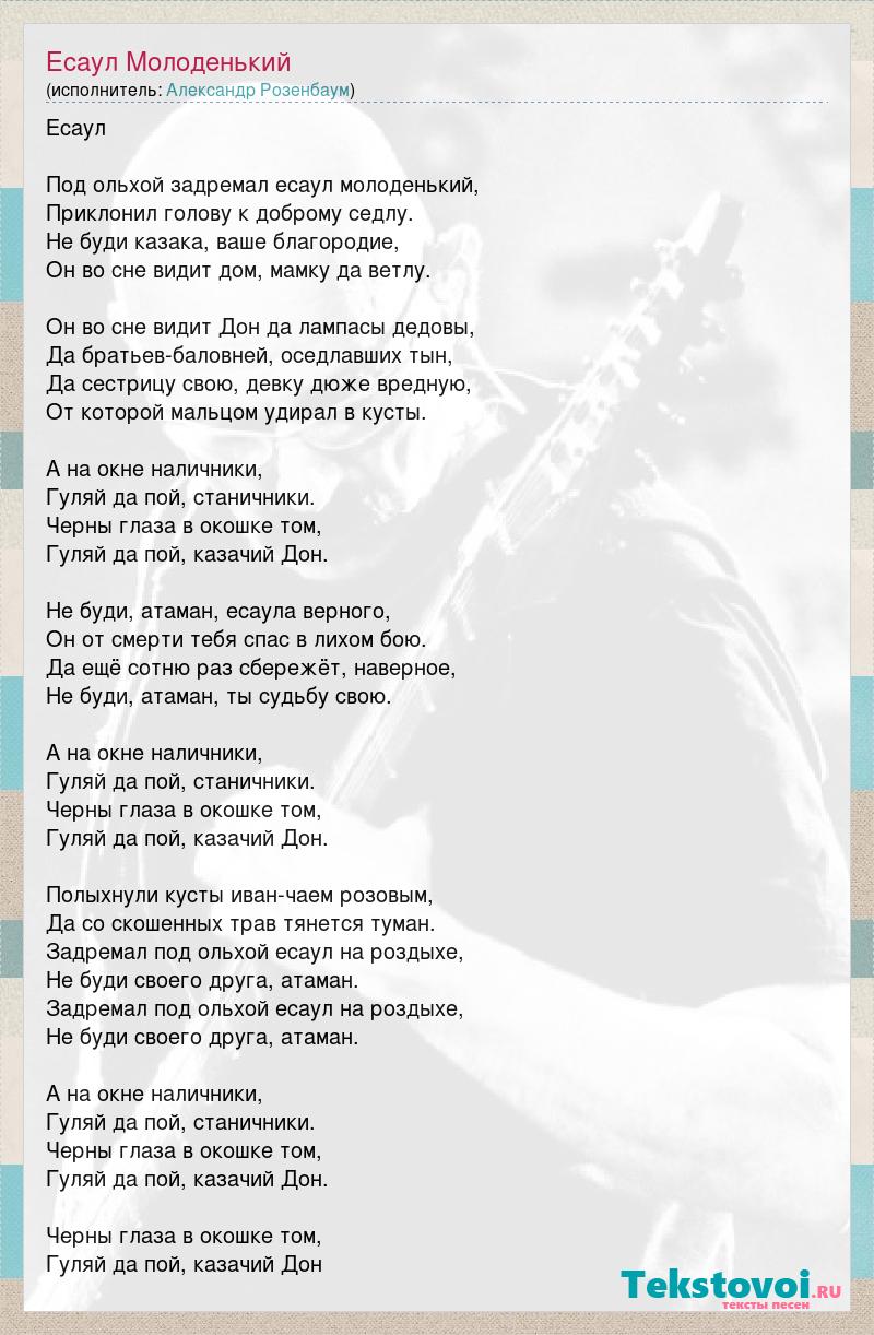 Есаул Под ольхой задремал есаул молоденький, Приклонил голову к доброму седлу. Не буди казака, ваше благородие, Он во сне видит дом, мамку да ветлу. Он во сне видит Дон да лампасы дедовы, Да братьев-баловней, оседлавших тын, Да сестрицу свою, девку дюже вредную, От которой мальцом удирал в кусты. А на окне наличники, Гуляй да пой, станичники. Черны глаза в окошке том, Гуляй да пой, казачий Дон. Не буди, атаман, есаула верного, Он от смерти тебя спас в лихом бою. Да ещё сотню раз сбережёт, наверное, Не буди, атаман, ты судьбу свою. А на окне наличники, Гуляй да пой, станичники. Черны глаза в окошке том, Гуляй да пой, казачий Дон. Полыхнули кусты иван-чаем розовым, Да со скошенных трав тянется туман. Задремал под ольхой есаул на роздыхе, Не буди своего друга, атаман. Задремал под ольхой есаул на роздыхе, Не буди своего друга, атаман. А на окне наличники, Гуляй да пой, станичники. Черны глаза в окошке том, Гуляй да пой, казачий Дон. Черны глаза в окошке том, Гуляй да пой, казачий Дон