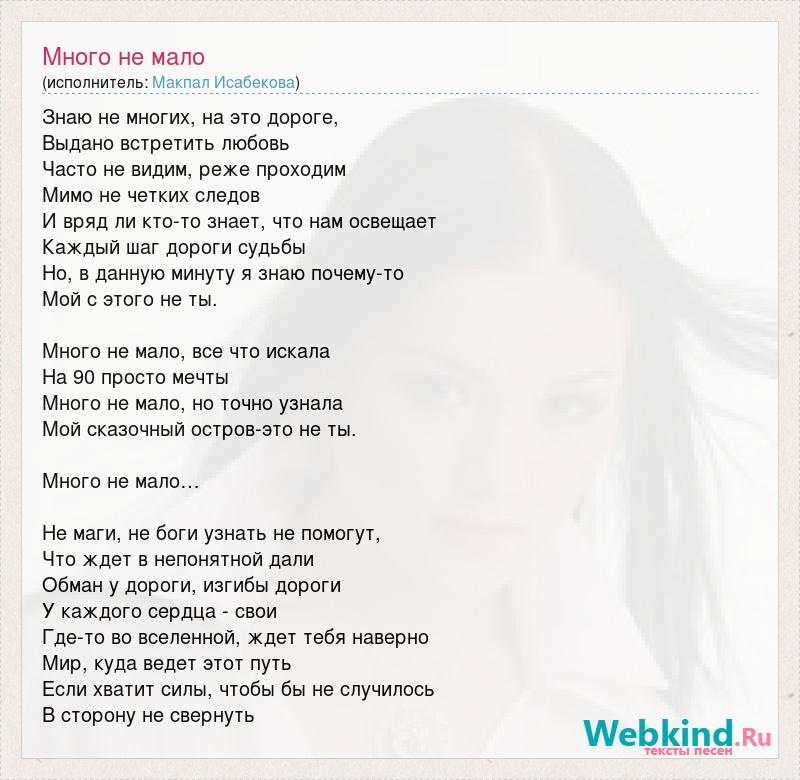 Знаю не многих, на это дороге, Выдано встретить любовь Часто не видим, реже проходим Мимо не четких следов И вряд ли кто-то знает, что нам освещает Каждый шаг дороги судьбы Но, в данную минуту я знаю почему-то Мой с этого не ты. Много не мало, все что искала На 90 просто мечты Много не мало, но точно узнала Мой сказочный остров-это не ты. Много не мало… Не маги, не боги узнать не помогут, Что ждет в непонятной дали Обман у дороги, изгибы дороги У каждого сердца - свои Где-то во вселенной, ждет тебя наверно Мир, куда ведет этот путь Если хватит силы, чтобы бы не случилось В сторону не свернуть