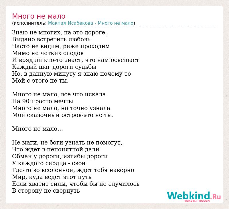 Знаю не многих, на это дороге, Выдано встретить любовь Часто не видим, реже проходим Мимо не четких следов И вряд ли кто-то знает, что нам освещает Каждый шаг дороги судьбы Но, в данную минуту я знаю почему-то Мой с этого не ты. Много не мало, все что искала На 90 просто мечты Много не мало, но точно узнала Мой сказочный остров-это не ты. Много не мало… Не маги, не боги узнать не помогут, Что ждет в непонятной дали Обман у дороги, изгибы дороги У каждого сердца - свои Где-то во вселенной, ждет тебя наверно Мир, куда ведет этот путь Если хватит силы, чтобы бы не случилось В сторону не свернуть