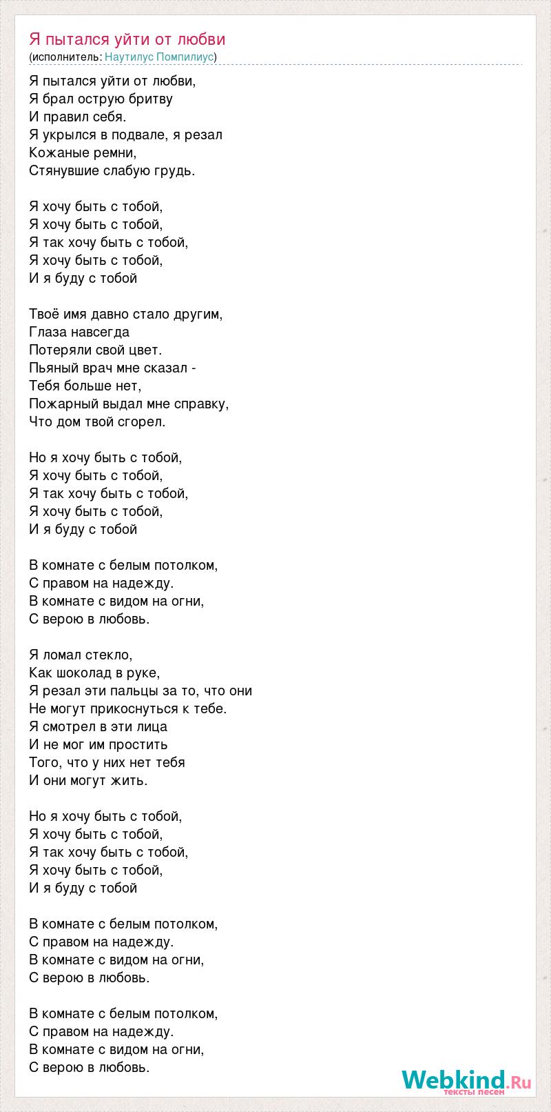 Я пытался уйти от любви, Я брал острую бритву И правил себя. Я укрылся в подвале, я резал Кожаные ремни, Стянувшие слабую грудь. Я хочу быть с тобой, Я хочу быть с тобой, Я так хочу быть с тобой, Я хочу быть с тобой, И я буду с тобой Твоё имя давно стало другим, Глаза навсегда Потеряли свой цвет. Пьяный врач мне сказал - Тебя больше нет, Пожарный выдал мне справку, Что дом твой сгорел. Но я хочу быть с тобой, Я хочу быть с тобой, Я так хочу быть с тобой, Я хочу быть с тобой, И я буду с тобой В комнате с белым потолком, С правом на надежду. В комнате с видом на огни, С верою в любовь. Я ломал стекло, Как шоколад в руке, Я резал эти пальцы за то, что они Не могут прикоснуться к тебе. Я смотрел в эти лица И не мог им простить Того, что у них нет тебя И они могут жить. Но я хочу быть с тобой, Я хочу быть с тобой, Я так хочу быть с тобой, Я хочу быть с тобой, И я буду с тобой В комнате с белым потолком, С правом на надежду. В комнате с видом на огни, С верою в любовь. В комнате с белым потолком, С правом на надежду. В комнате с видом на огни, С верою в любовь.