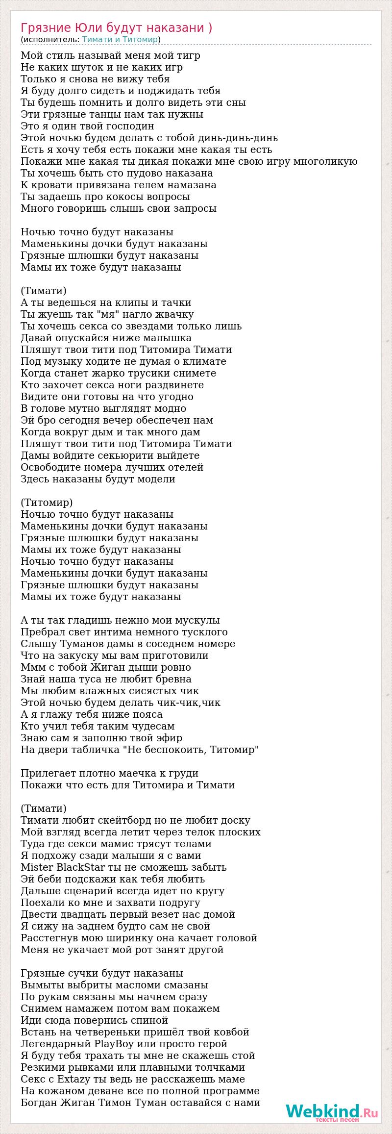 Мой стиль называй меня мой тигр Не каких шуток и не каких игр Только я снова не вижу тебя Я буду долго сидеть и поджидать тебя Ты будешь помнить и долго видеть эти сны Эти грязные танцы нам так нужны Это я один твой господин Этой ночью будем делать с тобой динь-динь-динь Есть я хочу тебя есть покажи мне какая ты есть Покажи мне какая ты дикая покажи мне свою игру многоликую Ты хочешь быть сто пудово наказана К кровати привязана гелем намазана Ты задаешь про кокосы вопросы Много говоришь слышь свои запросы Ночью точно будут наказаны Маменькины дочки будут наказаны Грязные шлюшки будут наказаны Мамы их тоже будут наказаны (Тимати) А ты ведешься на клипы и тачки Ты жуешь так "мя" нагло жвачку Ты хочешь секса со звездами только лишь Давай опускайся ниже малышка Пляшут твои тити под Титомира Тимати Под музыку ходите не думая о климате Когда станет жарко трусики снимете Кто захочет секса ноги раздвинете Видите они готовы на что угодно В голове мутно выглядят модно Эй бро сегодня вечер обеспечен нам Когда вокруг дым и так много дам Пляшут твои тити под Титомира Тимати Дамы войдите секьюрити выйдете Освободите номера лучших отелей Здесь наказаны будут модели (Титомир) Ночью точно будут наказаны Маменькины дочки будут наказаны Грязные шлюшки будут наказаны Мамы их тоже будут наказаны Ночью точно будут наказаны Маменькины дочки будут наказаны Грязные шлюшки будут наказаны Мамы их тоже будут наказаны А ты так гладишь нежно мои мускулы Пребрал свет интима немного тусклого Слышу Туманов дамы в соседнем номере Что на закуску мы вам приготовили Ммм с тобой Жиган дыши ровно Знай наша туса не любит бревна Мы любим влажных сисястых чик Этой ночью будем делать чик-чик,чик А я глажу тебя ниже пояса Кто учил тебя таким чудесам Знаю сам я заполню твой эфир На двери табличка "Не беспокоить, Титомир" Прилегает плотно маечка к груди Покажи что есть для Титомира и Тимати (Тимати) Тимати любит скейтборд но не любит доску Мой взгляд всегда летит через телок плоских Туда где секси мамис трясут телами Я подхожу сзади малыши я с вами Mister BlackStar ты не сможешь забыть Эй беби подскажи как тебя любить Дальше сценарий всегда идет по кругу Поехали ко мне и захвати подругу Двести двадцать первый везет нас домой Я сижу на заднем будто сам не свой Расстегнув мою ширинку она качает головой Меня не укачает мой рот занят другой Грязные сучки будут наказаны Вымыты выбриты масломи смазаны По рукам связаны мы начнем сразу Снимем намажем потом вам покажем Иди сюда повернись спиной Встань на четвереньки пришёл твой ковбой Легендарный PlayBoy или просто герой Я буду тебя трахать ты мне не скажешь стой Резкими рывками или плавными толчками Секс с Extazy ты ведь не расскажешь маме На кожаном деване все по полной программе Богдан Жиган Тимон Туман оставайся с нами