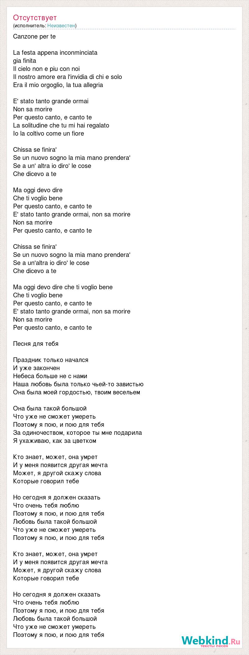 Canzone per te La festa appena inconminciata gia finita Il cielo non e piu con noi Il nostro amore era l'invidia di chi e solo Era il mio orgoglio, la tua allegria E' stato tanto grande ormai Non sa morire Per questo canto, e canto te La solitudine che tu mi hai regalato Io la coltivo come un fiore Chissa se finira' Se un nuovo sogno la mia mano prendera' Se a un' altra io diro' le cose Che dicevo a te Ma oggi devo dire Che ti voglio bene Per questo canto, e canto te E' stato tanto grande ormai, non sa morire Non sa morire Per questo canto, e canto te Chissa se finira' Se un nuovo sogno la mia mano prendera' Se a un'altra io diro' le cose Che dicevo a te Ma oggi devo dire che ti voglio bene Che ti voglio bene Per questo canto, e canto te E' stato tanto grande ormai, non sa morire Non sa morire Per questo canto, e canto te Песня для тебя Праздник только начался И уже закончен Небеса больше не с нами Наша любовь была только чьей-то завистью Она была моей гордостью, твоим весельем Она была такой большой Что уже не сможет умереть Поэтому я пою, и пою для тебя За одиночеством, которое ты мне подарила Я ухаживаю, как за цветком Кто знает, может, она умрет И у меня появится другая мечта Может, я другой скажу слова Которые говорил тебе Но сегодня я должен сказать Что очень тебя люблю Поэтому я пою, и пою для тебя Любовь была такой большой Что уже не сможет умереть Поэтому я пою, и пою для тебя Кто знает, может, она умрет И у меня появится другая мечта Может, я другой скажу слова Которые говорил тебе Но сегодня я должен сказать Что очень тебя люблю Поэтому я пою, и пою для тебя Любовь была такой большой Что уже не сможет умереть Поэтому я пою, и пою для тебя