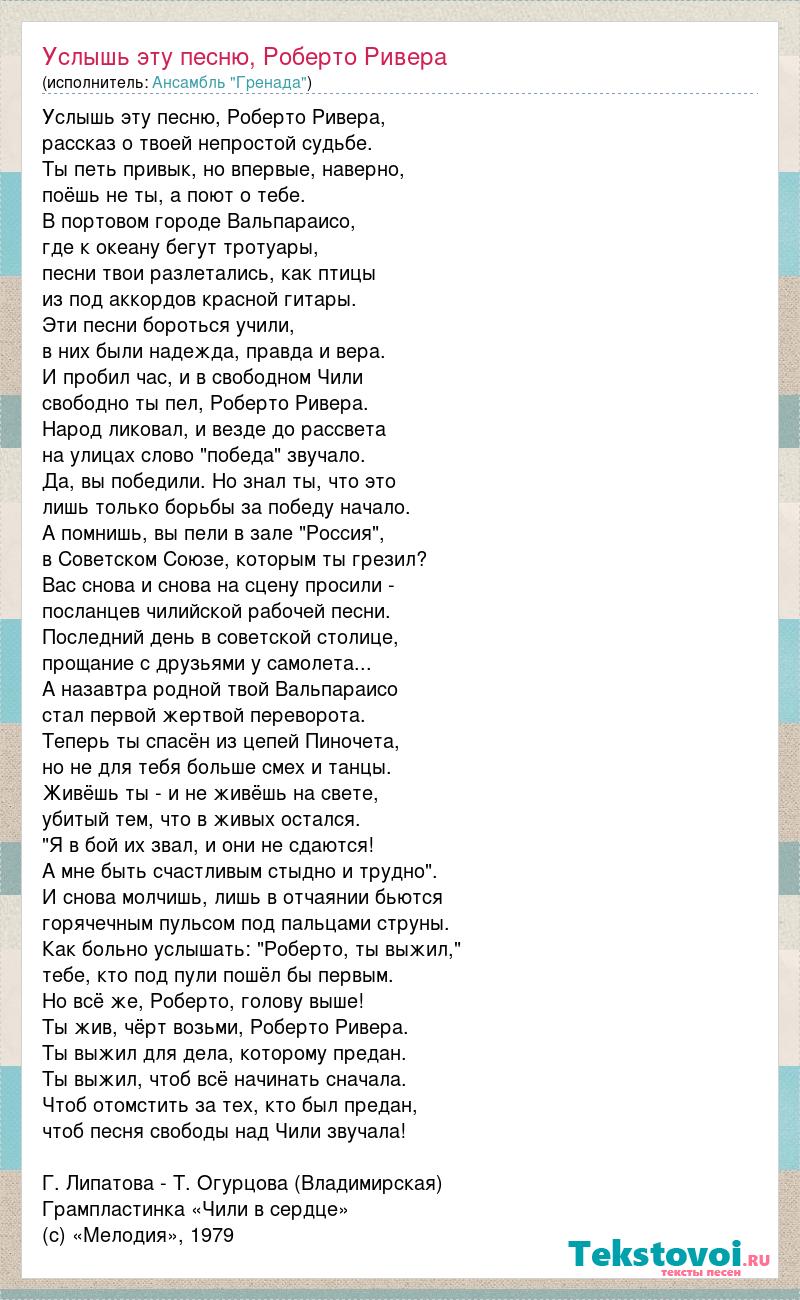 Услышь эту песню, Роберто Ривера, рассказ о твоей непростой судьбе. Ты петь привык, но впервые, наверно, поёшь не ты, а поют о тебе. В портовом городе Вальпараисо, где к океану бегут тротуары, песни твои разлетались, как птицы из под аккордов красной гитары. Эти песни бороться учили, в них были надежда, правда и вера. И пробил час, и в свободном Чили свободно ты пел, Роберто Ривера. Народ ликовал, и везде до рассвета на улицах слово "победа" звучало. Да, вы победили. Но знал ты, что это лишь только борьбы за победу начало. А помнишь, вы пели в зале "Россия", в Советском Союзе, которым ты грезил? Вас снова и снова на сцену просили - посланцев чилийской рабочей песни. Последний день в советской столице, прощание с друзьями у самолета... А назавтра родной твой Вальпараисо стал первой жертвой переворота. Теперь ты спасён из цепей Пиночета, но не для тебя больше смех и танцы. Живёшь ты - и не живёшь на свете, убитый тем, что в живых остался. "Я в бой их звал, и они не сдаются! А мне быть счастливым стыдно и трудно". И снова молчишь, лишь в отчаянии бьются горячечным пульсом под пальцами струны. Как больно услышать: "Роберто, ты выжил," тебе, кто под пули пошёл бы первым. Но всё же, Роберто, голову выше! Ты жив, чёрт возьми, Роберто Ривера. Ты выжил для дела, которому предан. Ты выжил, чтоб всё начинать сначала. Чтоб отомстить за тех, кто был предан, чтоб песня свободы над Чили звучала! Г. Липатова - Т. Огурцова (Владимирская) Грампластинка «Чили в сердце» (с) «Мелодия», 1979