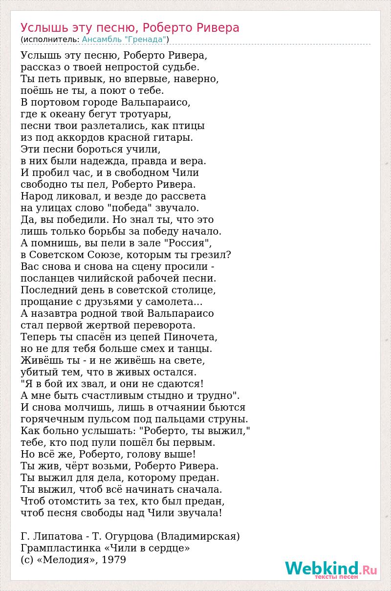 Услышь эту песню, Роберто Ривера, рассказ о твоей непростой судьбе. Ты петь привык, но впервые, наверно, поёшь не ты, а поют о тебе. В портовом городе Вальпараисо, где к океану бегут тротуары, песни твои разлетались, как птицы из под аккордов красной гитары. Эти песни бороться учили, в них были надежда, правда и вера. И пробил час, и в свободном Чили свободно ты пел, Роберто Ривера. Народ ликовал, и везде до рассвета на улицах слово "победа" звучало. Да, вы победили. Но знал ты, что это лишь только борьбы за победу начало. А помнишь, вы пели в зале "Россия", в Советском Союзе, которым ты грезил? Вас снова и снова на сцену просили - посланцев чилийской рабочей песни. Последний день в советской столице, прощание с друзьями у самолета... А назавтра родной твой Вальпараисо стал первой жертвой переворота. Теперь ты спасён из цепей Пиночета, но не для тебя больше смех и танцы. Живёшь ты - и не живёшь на свете, убитый тем, что в живых остался. "Я в бой их звал, и они не сдаются! А мне быть счастливым стыдно и трудно". И снова молчишь, лишь в отчаянии бьются горячечным пульсом под пальцами струны. Как больно услышать: "Роберто, ты выжил," тебе, кто под пули пошёл бы первым. Но всё же, Роберто, голову выше! Ты жив, чёрт возьми, Роберто Ривера. Ты выжил для дела, которому предан. Ты выжил, чтоб всё начинать сначала. Чтоб отомстить за тех, кто был предан, чтоб песня свободы над Чили звучала! Г. Липатова - Т. Огурцова (Владимирская) Грампластинка «Чили в сердце» (с) «Мелодия», 1979