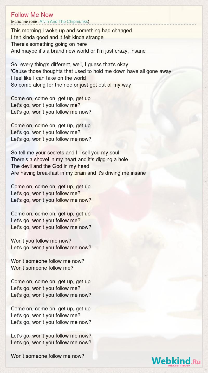 This morning I woke up and something had changed I felt kinda good and it felt kinda strange There's something going on here And maybe it's a brand new world or I'm just crazy, insane So, every thing's different, well, I guess that's okay 'Cause those thoughts that used to hold me down have all gone away I feel like I can take on the world So come along for the ride or just get out of my way Come on, come on, get up, get up Let's go, won't you follow me? Let's go, won't you follow me now? Come on, come on, get up, get up Let's go, won't you follow me? Let's go, won't you follow me now? So tell me your secrets and I'll sell you my soul There's a shovel in my heart and it's digging a hole The devil and the God in my head Are having breakfast in my brain and it's driving me insane Come on, come on, get up, get up Let's go, won't you follow me? Let's go, won't you follow me now? Come on, come on, get up, get up Let's go, won't you follow me? Let's go, won't you follow me now? Won't you follow me now? Let's go, won't you follow me now? Won't someone follow me now? Won't someone follow me? Come on, come on, get up, get up Let's go, won't you follow me? Let's go, won't you follow me now? Come on, come on, get up, get up Let's go, won't you follow me? Let's go, won't you follow me now? Let's go, won't you follow me now? Let's go, won't you follow me now? Won't someone follow me now?