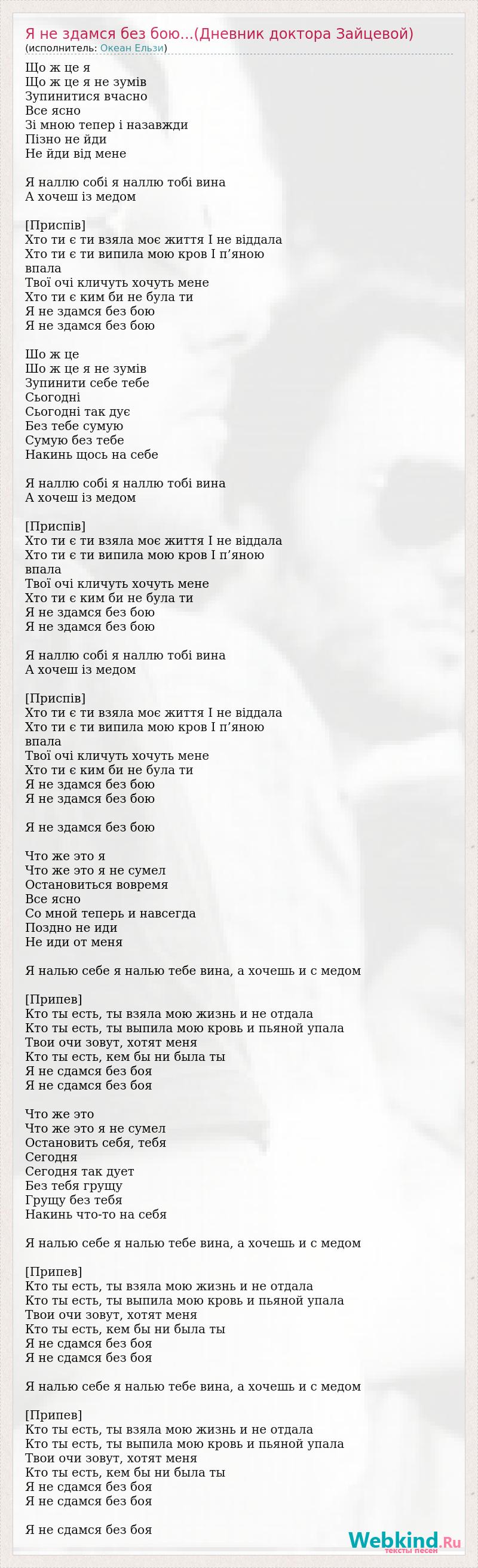 Що ж це я Що ж це я не зумів Зупинитися вчасно Все ясно Зі мною тепер і назавжди Пізно не йди Не йди від мене Я наллю собі я наллю тобі вина А хочеш із медом [Приспів] Хто ти є ти взяла моє життя І не віддала Хто ти є ти випила мою кров І п’яною впала Твої очі кличуть хочуть мене Хто ти є ким би не була ти Я не здамся без бою Я не здамся без бою Шо ж це Шо ж це я не зумів Зупинити себе тебе Сьогодні Сьогодні так дує Без тебе сумую Сумую без тебе Накинь щось на себе Я наллю собі я наллю тобі вина А хочеш із медом [Приспів] Хто ти є ти взяла моє життя І не віддала Хто ти є ти випила мою кров І п’яною впала Твої очі кличуть хочуть мене Хто ти є ким би не була ти Я не здамся без бою Я не здамся без бою Я наллю собі я наллю тобі вина А хочеш із медом [Приспів] Хто ти є ти взяла моє життя І не віддала Хто ти є ти випила мою кров І п’яною впала Твої очі кличуть хочуть мене Хто ти є ким би не була ти Я не здамся без бою Я не здамся без бою Я не здамся без бою Что же это я Что же это я не сумел Остановиться вовремя Все ясно Со мной теперь и навсегда Поздно не иди Не иди от меня Я налью себе я налью тебе вина, а хочешь и с медом [Припев] Кто ты есть, ты взяла мою жизнь и не отдала Кто ты есть, ты выпила мою кровь и пьяной упала Твои очи зовут, хотят меня Кто ты есть, кем бы ни была ты Я не сдамся без боя Я не сдамся без боя Что же это Что же это я не сумел Остановить себя, тебя Сегодня Сегодня так дует Без тебя грущу Грущу без тебя Накинь что-то на себя Я налью себе я налью тебе вина, а хочешь и с медом [Припев] Кто ты есть, ты взяла мою жизнь и не отдала Кто ты есть, ты выпила мою кровь и пьяной упала Твои очи зовут, хотят меня Кто ты есть, кем бы ни была ты Я не сдамся без боя Я не сдамся без боя Я налью себе я налью тебе вина, а хочешь и с медом [Припев] Кто ты есть, ты взяла мою жизнь и не отдала Кто ты есть, ты выпила мою кровь и пьяной упала Твои очи зовут, хотят меня Кто ты есть, кем бы ни была ты Я не сдамся без боя Я не сдамся без боя Я не сдамся без боя