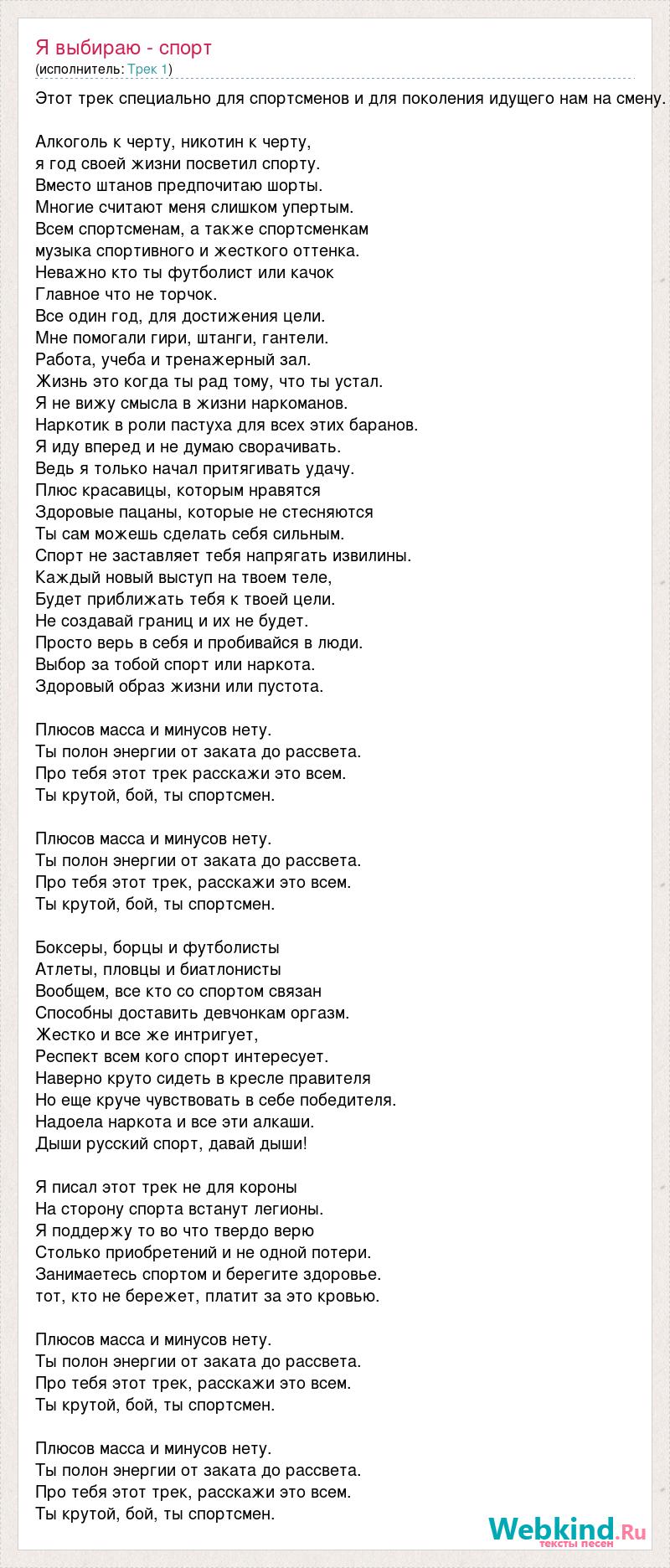 Этот трек специально для спортсменов и для поколения идущего нам на смену. Алкоголь к черту, никотин к черту, я год своей жизни посветил спорту. Вместо штанов предпочитаю шорты. Многие считают меня слишком упертым. Всем спортсменам, а также спортсменкам музыка спортивного и жесткого оттенка. Неважно кто ты футболист или качок Главное что не торчок. Все один год, для достижения цели. Мне помогали гири, штанги, гантели. Работа, учеба и тренажерный зал. Жизнь это когда ты рад тому, что ты устал. Я не вижу смысла в жизни наркоманов. Наркотик в роли пастуха для всех этих баранов. Я иду вперед и не думаю сворачивать. Ведь я только начал притягивать удачу. Плюс красавицы, которым нравятся Здоровые пацаны, которые не стесняются Ты сам можешь сделать себя сильным. Спорт не заставляет тебя напрягать извилины. Каждый новый выступ на твоем теле, Будет приближать тебя к твоей цели. Не создавай границ и их не будет. Просто верь в себя и пробивайся в люди. Выбор за тобой спорт или наркота. Здоровый образ жизни или пустота. Плюсов масса и минусов нету. Ты полон энергии от заката до рассвета. Про тебя этот трек расскажи это всем. Ты крутой, бой, ты спортсмен. Плюсов масса и минусов нету. Ты полон энергии от заката до рассвета. Про тебя этот трек, расскажи это всем. Ты крутой, бой, ты спортсмен. Боксеры, борцы и футболисты Атлеты, пловцы и биатлонисты Вообщем, все кто со спортом связан Способны доставить девчонкам оргазм. Жестко и все же интригует, Респект всем кого спорт интересует. Наверно круто сидеть в кресле правителя Но еще круче чувствовать в себе победителя. Надоела наркота и все эти алкаши. Дыши русский спорт, давай дыши! Я писал этот трек не для короны На сторону спорта встанут легионы. Я поддержу то во что твердо верю Столько приобретений и не одной потери. Занимаетесь спортом и берегите здоровье. тот, кто не бережет, платит за это кровью. Плюсов масса и минусов нету. Ты полон энергии от заката до рассвета. Про тебя этот трек, расскажи это всем. Ты крутой, бой, ты спортсмен. Плюсов масса и минусов нету. Ты полон энергии от заката до рассвета. Про тебя этот трек, расскажи это всем. Ты крутой, бой, ты спортсмен.