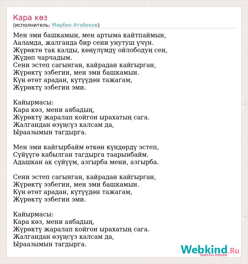 Мен эми башкамын, мен артыма кайтпаймын, Ааламда, жалганда бир сени унутуш үчүн. Жүрөктө так калды, көңүлүмдү ойлободуң сен, Жүдөп чарчадым. Сени эстеп сагынган, кайрадан кайгырган, Жүрөктү эзбегин, мен эми башкамын. Күн өтөт арадан, күтүүдөн тажагам, Жүрөктү эзбегин эми. Кайырмасы: Кара көз, мени аябадың, Жүрөктү жаралап койгон ырахатың сага. Жалгандан өзүңсүз калсам да, Ыраазымын тагдырга. Мен эми кайгырбайм өткөн күндөрдү эстеп, Сүйүүгө кабылган тагдырга таарынбайм. Адашкан ак сүйүүм, азгырба мени, азгырба. Сени эстеп сагынган, кайрадан кайгырган, Жүрөктү эзбегин, мен эми башкамын. Күн өтөт арадан, күтүүдөн тажагам, Жүрөктү эзбегин эми. Кайырмасы: Кара көз, мени аябадың, Жүрөктү жаралап койгон ырахатың сага. Жалгандан өзүңсүз калсам да, Ыраазымын тагдырга.