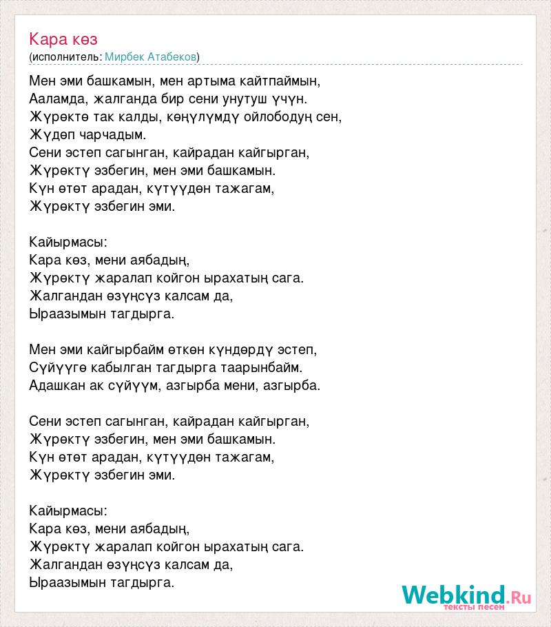 Мен эми башкамын, мен артыма кайтпаймын, Ааламда, жалганда бир сени унутуш үчүн. Жүрөктө так калды, көңүлүмдү ойлободуң сен, Жүдөп чарчадым. Сени эстеп сагынган, кайрадан кайгырган, Жүрөктү эзбегин, мен эми башкамын. Күн өтөт арадан, күтүүдөн тажагам, Жүрөктү эзбегин эми. Кайырмасы: Кара көз, мени аябадың, Жүрөктү жаралап койгон ырахатың сага. Жалгандан өзүңсүз калсам да, Ыраазымын тагдырга. Мен эми кайгырбайм өткөн күндөрдү эстеп, Сүйүүгө кабылган тагдырга таарынбайм. Адашкан ак сүйүүм, азгырба мени, азгырба. Сени эстеп сагынган, кайрадан кайгырган, Жүрөктү эзбегин, мен эми башкамын. Күн өтөт арадан, күтүүдөн тажагам, Жүрөктү эзбегин эми. Кайырмасы: Кара көз, мени аябадың, Жүрөктү жаралап койгон ырахатың сага. Жалгандан өзүңсүз калсам да, Ыраазымын тагдырга.