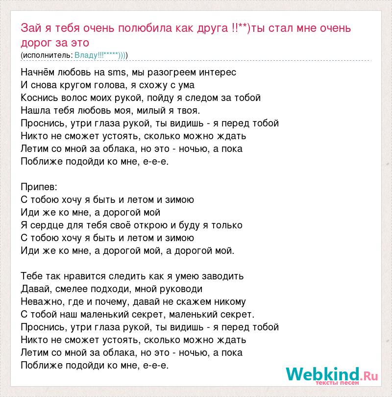 Начнём любовь на sms, мы разогреем интерес И снова кругом голова, я схожу с ума Коснись волос моих рукой, пойду я следом за тобой Нашла тебя любовь моя, милый я твоя. Проснись, утри глаза рукой, ты видишь - я перед тобой Никто не сможет устоять, сколько можно ждать Летим со мной за облака, но это - ночью, а пока Поближе подойди ко мне, е-е-е. Припев: С тобою хочу я быть и летом и зимою Иди же ко мне, а дорогой мой Я сердце для тебя своё открою и буду я только С тобою хочу я быть и летом и зимою Иди же ко мне, а дорогой мой, а дорогой мой. Тебе так нравится следить как я умею заводить Давай, смелее подходи, мной руководи Неважно, где и почему, давай не скажем никому С тобой наш маленький секрет, маленький секрет. Проснись, утри глаза рукой, ты видишь - я перед тобой Никто не сможет устоять, сколько можно ждать Летим со мной за облака, но это - ночью, а пока Поближе подойди ко мне, е-е-е.